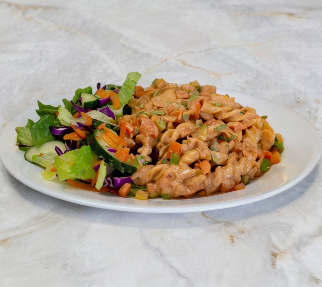 Pasta fusilli con 140 gr de pechuga en salsa de chipotle acompañado de ensalada fresca.