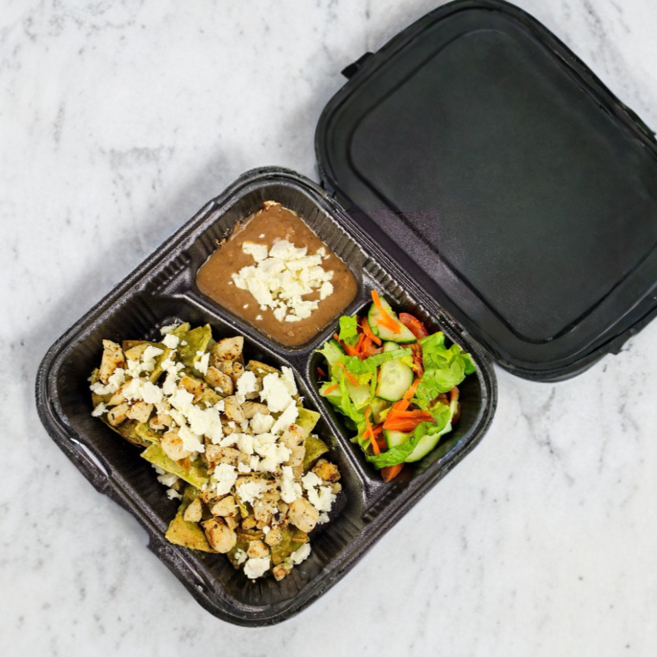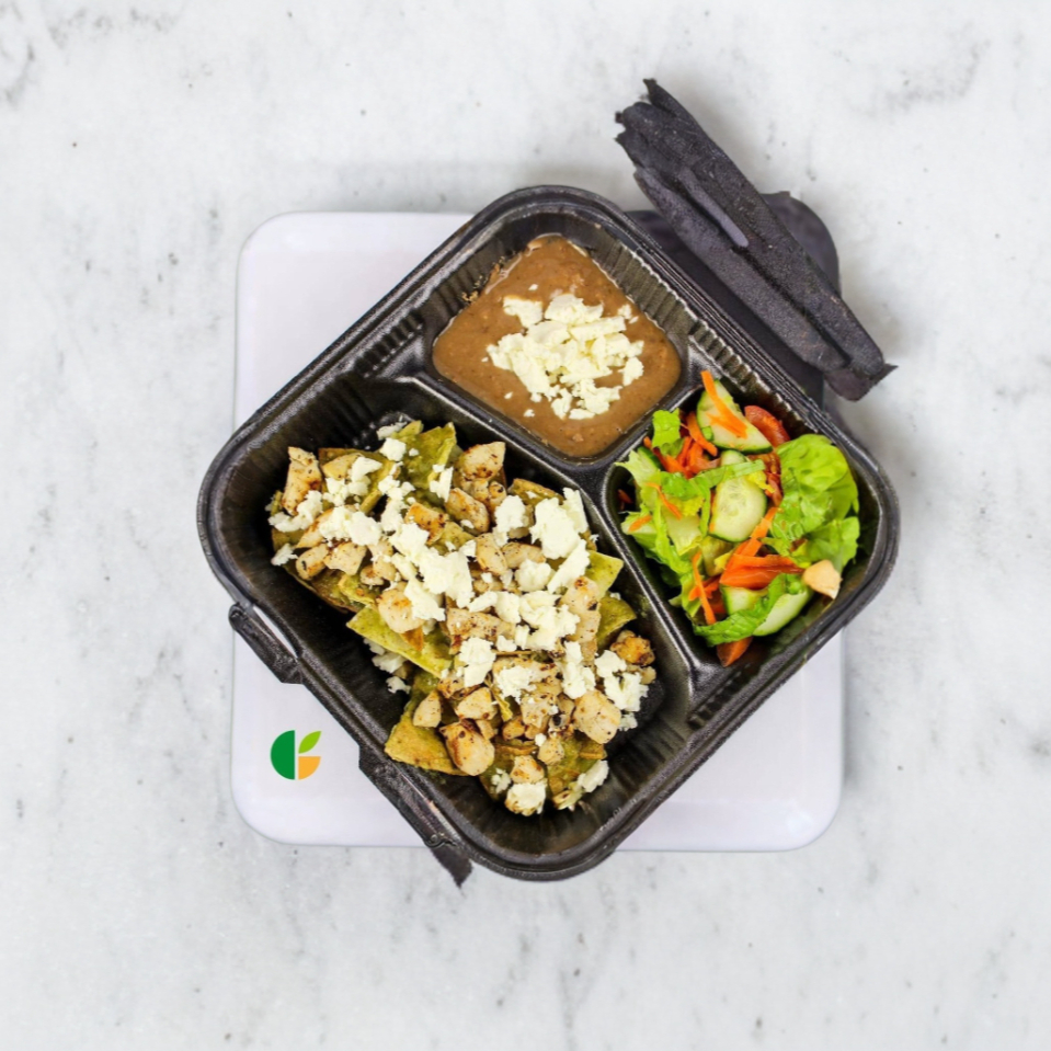 Chilaquiles de tortilla horneada en salsa de tu elección con pollo, acompañados de ensalada y frijoles.