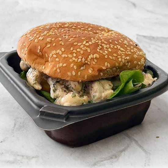 Hamburguesa de pollo (140 gr) bañado en nuestro aderezo especial, queso panela, cebolla caramelizada en mostaza y miel, lechuga, tomate y aguacate.