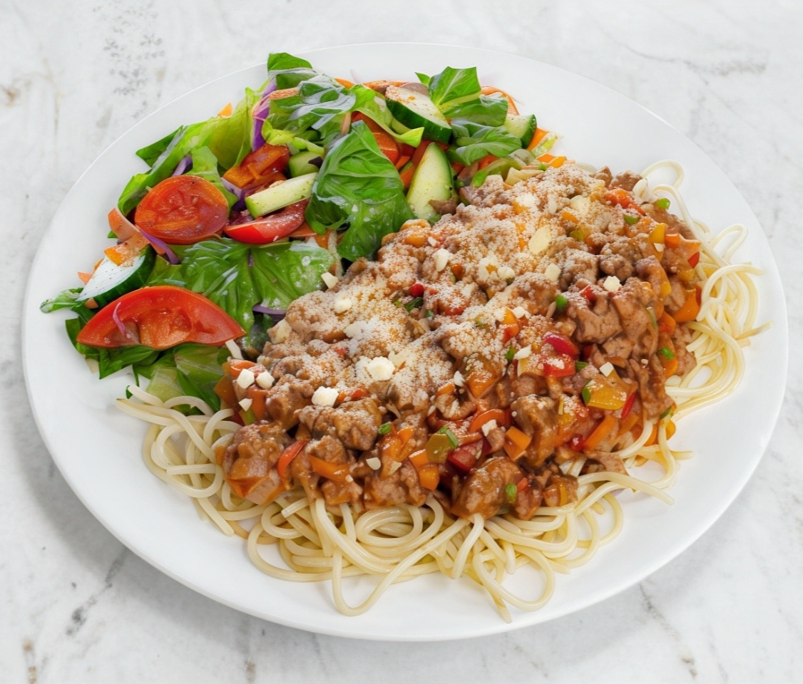 140 g de carne a la boloñesa, 1 taza de pasta, espolvoreado con queso parmesano y ensalada fresca (porción personal).