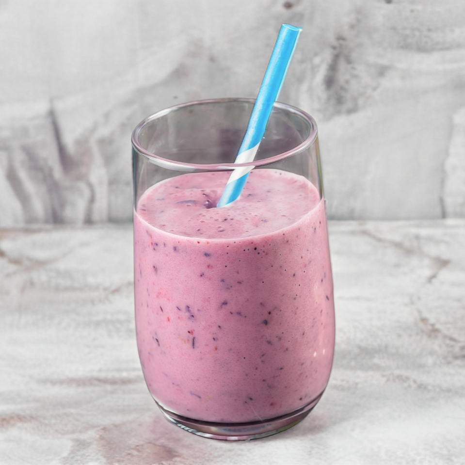 Delicioso smoothie de fresas, moras y leche deslactosada baja en grasa, con un toque de avena y hielo.