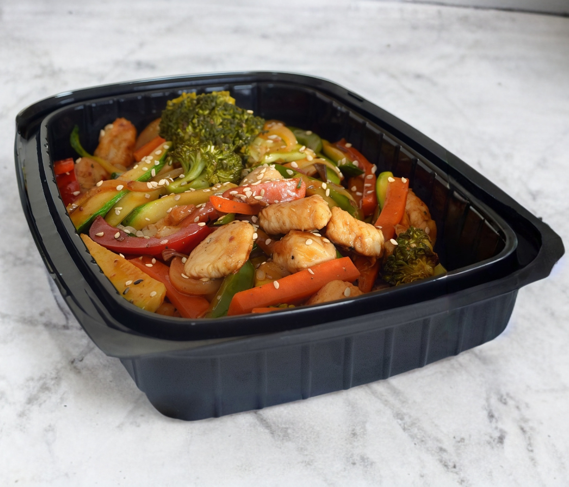 Pimiento morrón, calabaza, zanahoria y brócoli guisada en salsa teriyaki acompañada de 3/4 de tz de arroz.1 ingrediente a elegir.