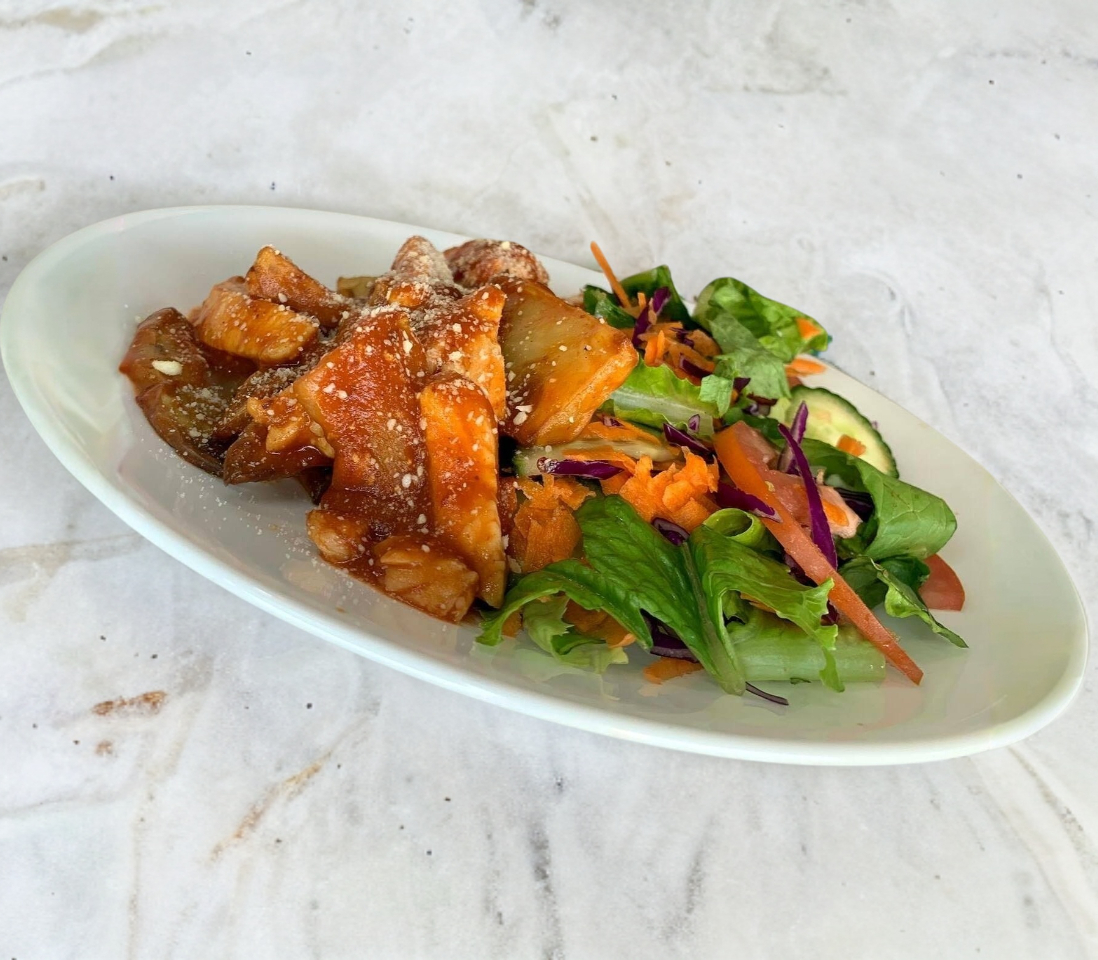 140Gr de pechuga, 1 taza de papas horneadas salseada en salsa a la diabla (espolvoreadas en queso parmesano) y ensalada fresca.