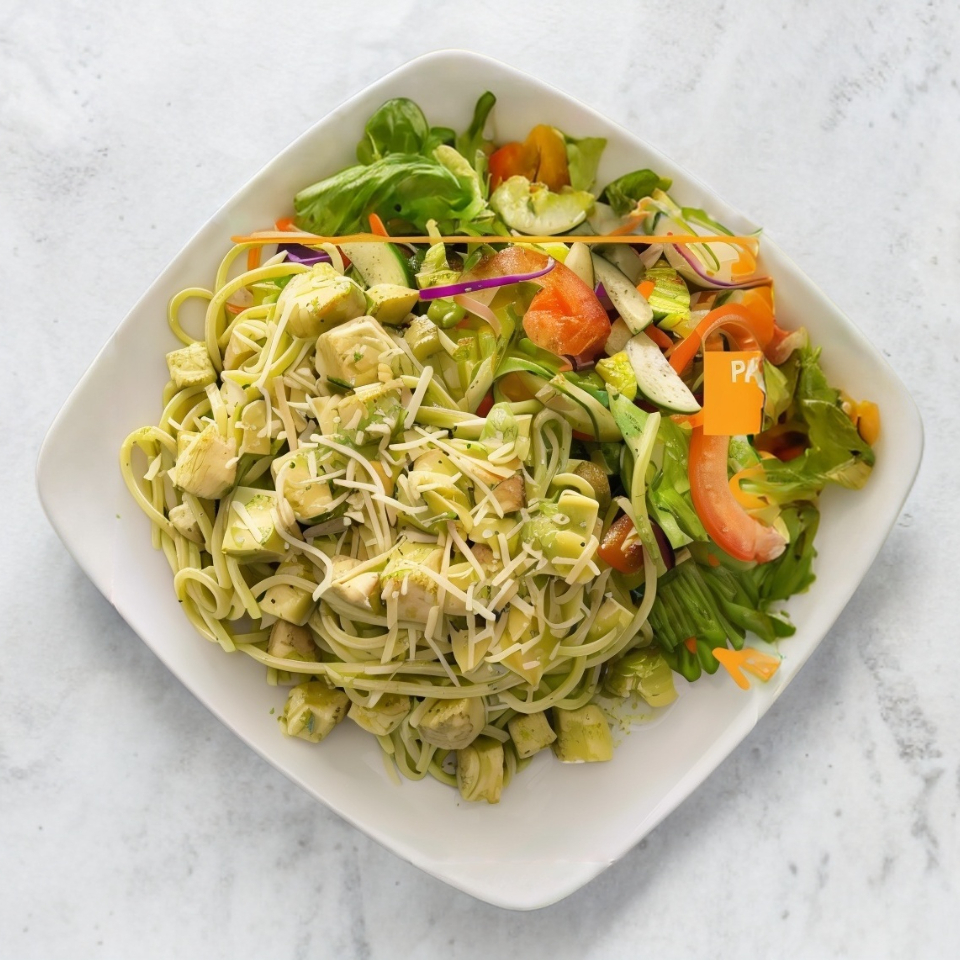 Pechuga de pollo guisada con verduras, pasta. Bañado en nuestro aderezo de chile serrano y espinaca con parmesano. Acompañado de esanada.