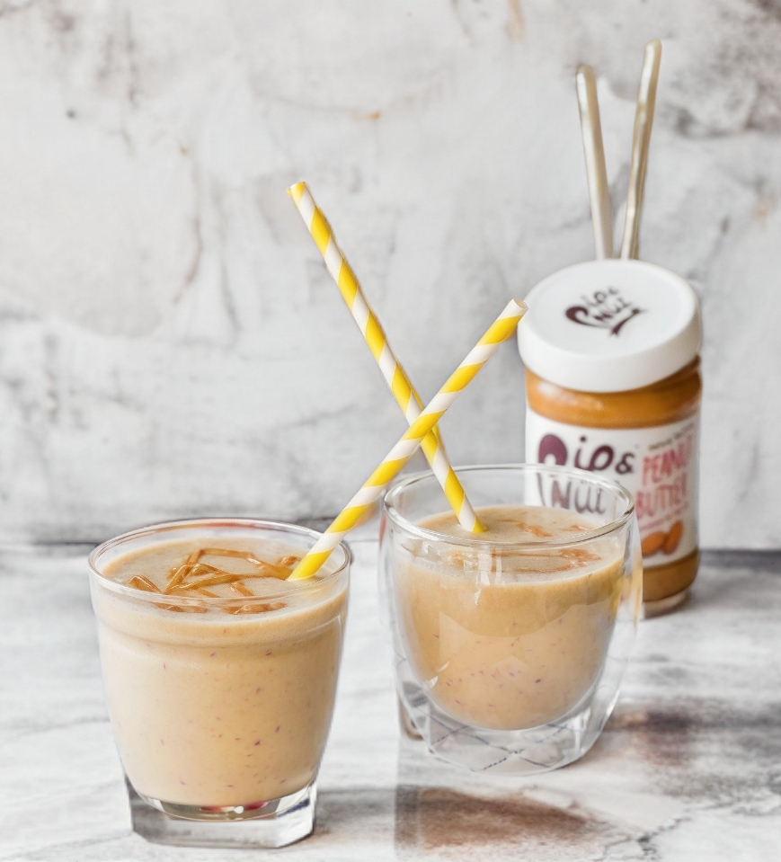 Smoothie de manzana y mantequilla de maní, leche deslactosada baja en grasa, canela, miel y hielo