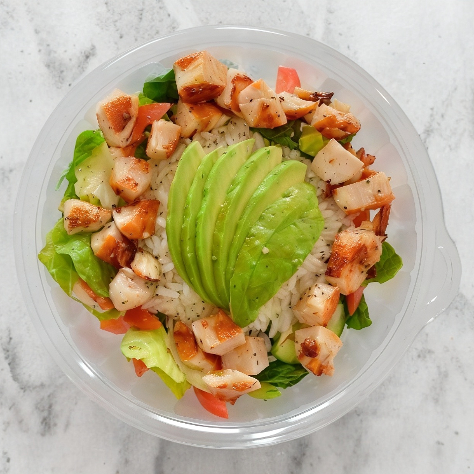 Base de ensalada fresca, 1/4 de arroz y topping de aguacate. (Proteína a elección) 1 solo ingrediente.
