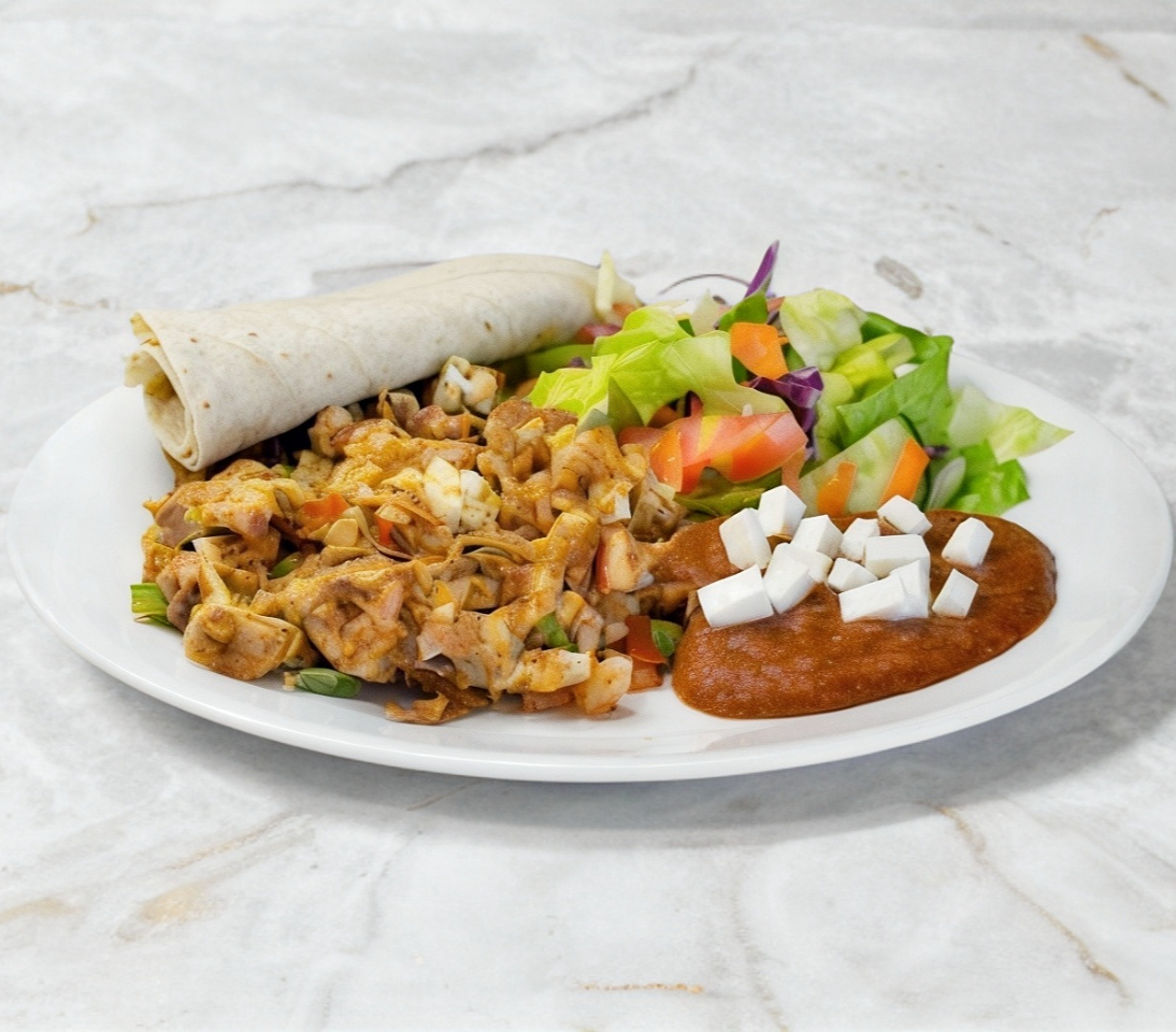 2 Huevos enteros con una porción de machaca, tomate, chile y cebolla, acompañado de ensalada fresca, frijoles, salsa tatemada y 3 tortillas de maíz.
