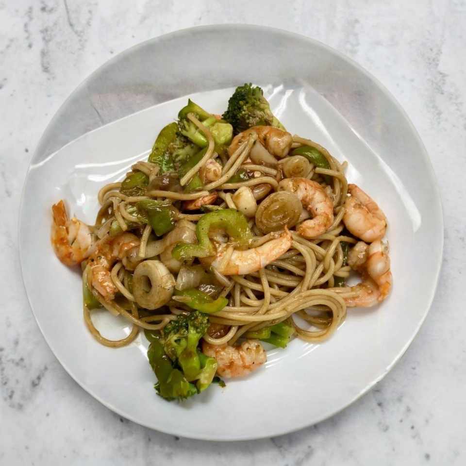 Pechuga de pollo, res o camaron salteada de morron, cebolla, brocoli y espagueti; bañado en salsa teriyaki de la casa.