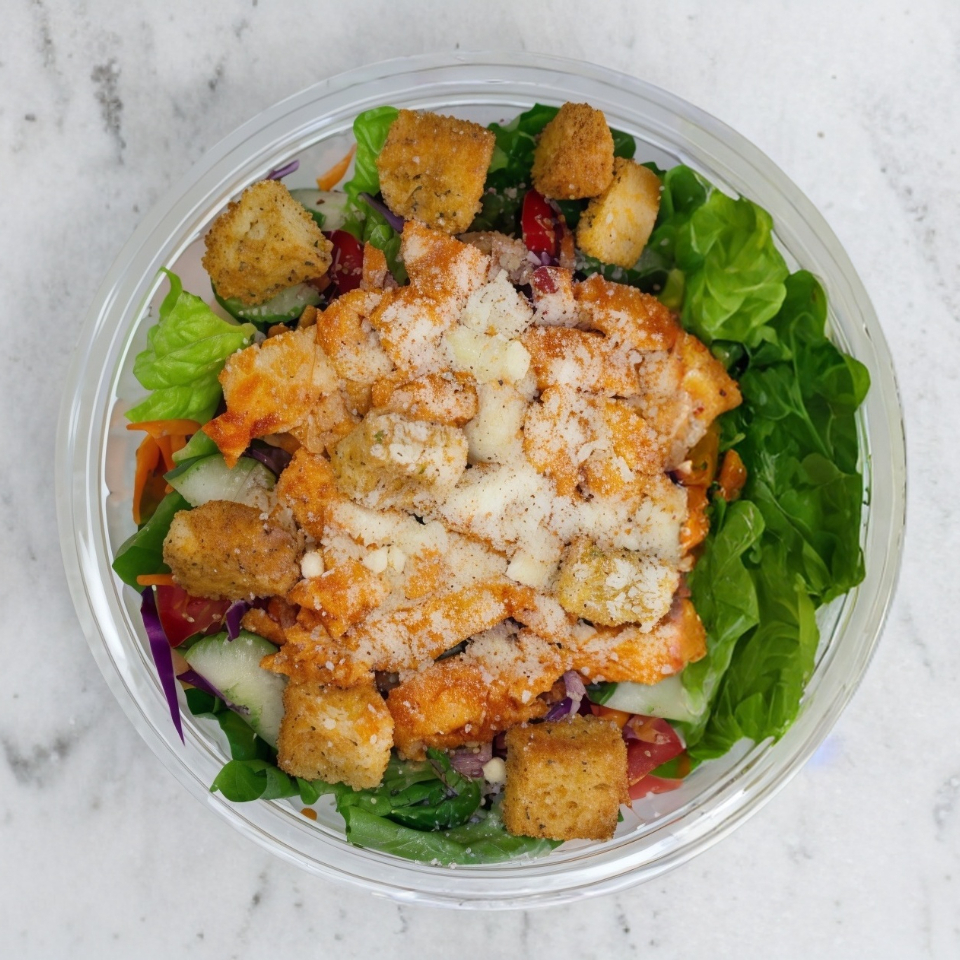 Tenders de pechuga de pollo empanizados en avena, bañado en salsa a elegir (búfalo o BBQ); montado sobre ensalada. Acompañado de aderezo ranch.