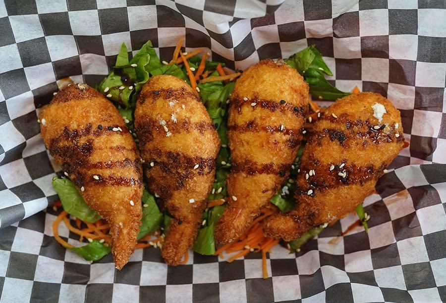 Tres camarones rellenos de queso crema, empanizados con panko, acompañados de ensalada mixta y salsa teriyaki