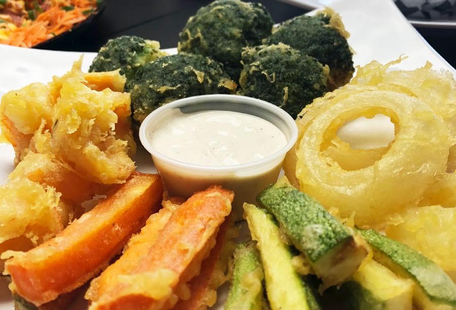 Vegetales y camarones capeados, acompañados de aderezo ranch