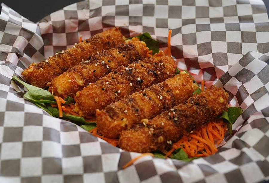 Cinco dedos de queso empanizados con panko, acompañados de ensalada mixta y salsa teriyaki