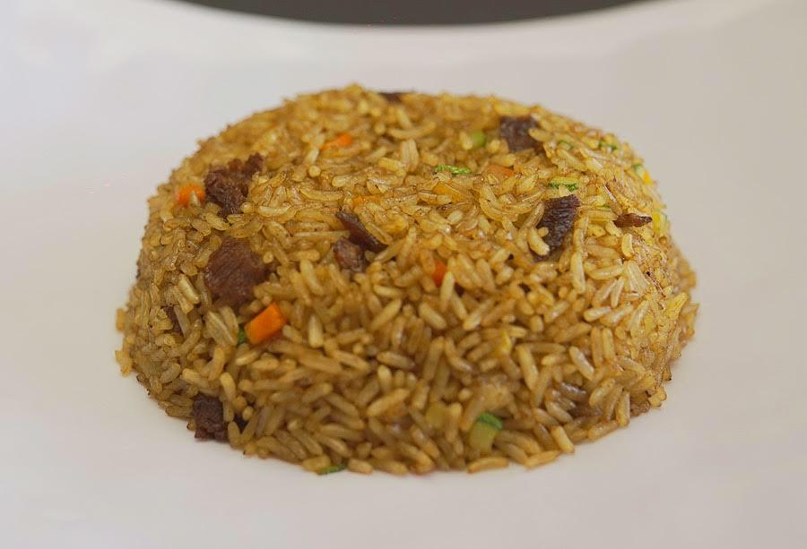 Arroz planchado con vegetales, carne de res y salsas orientales, acompañados de aderezo chipotle y salsa de soya