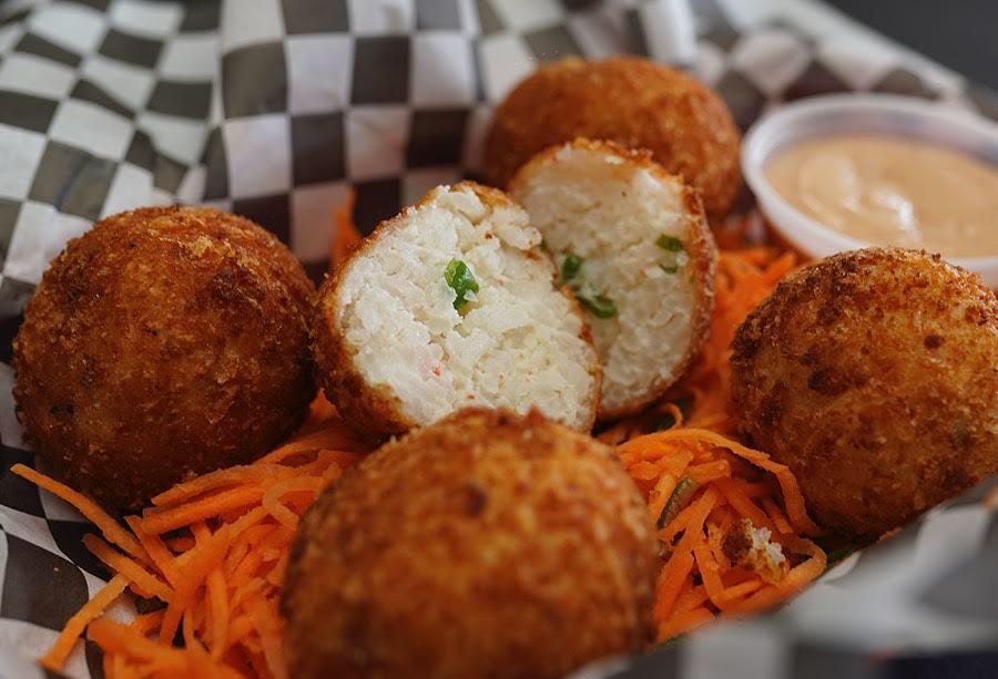 Bolitas empanizadas de nuestra pasta hecha a base de arroz, tampico, cebollín y queso crema, acompañadas de zanahoria, cebollín, aderezo de chipotle y salsa soya