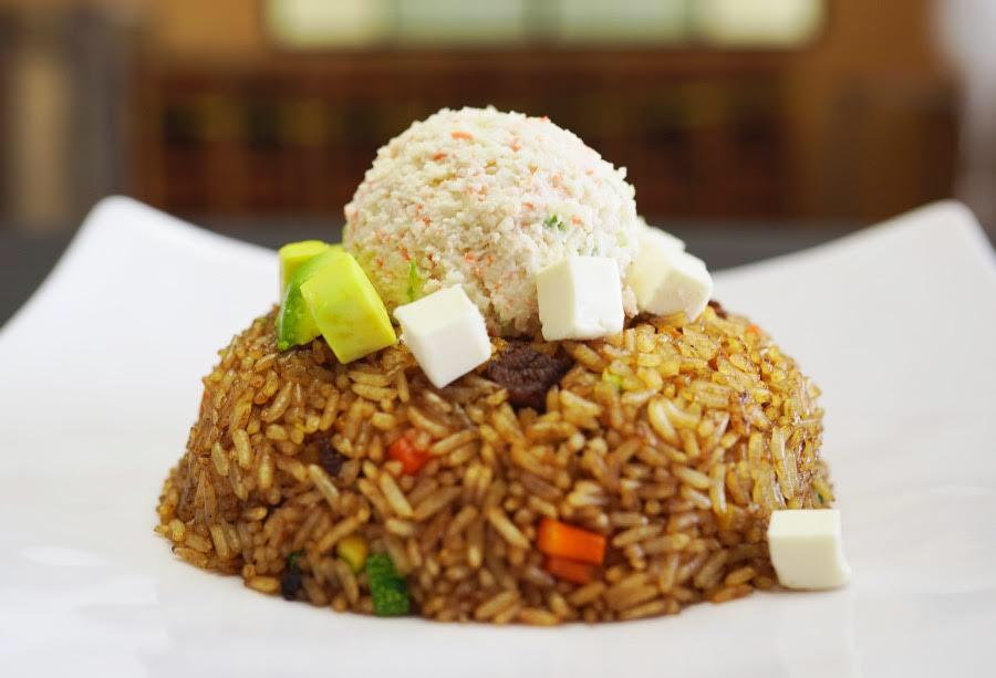 Arroz planchado con vegetales, carne de res y salsas orientales, con tampico, queso crema y aguacate, acompañados de aderezo de chipotle y salsa de soya.