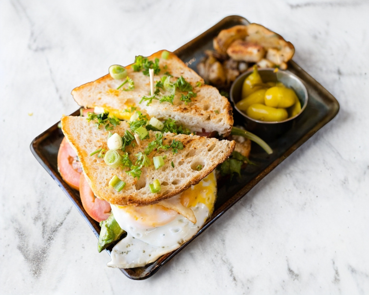 Pan blanco, alioli de ajo, 2 huevos, tocino, queso manchego, lechuga, tomate y aguacate.