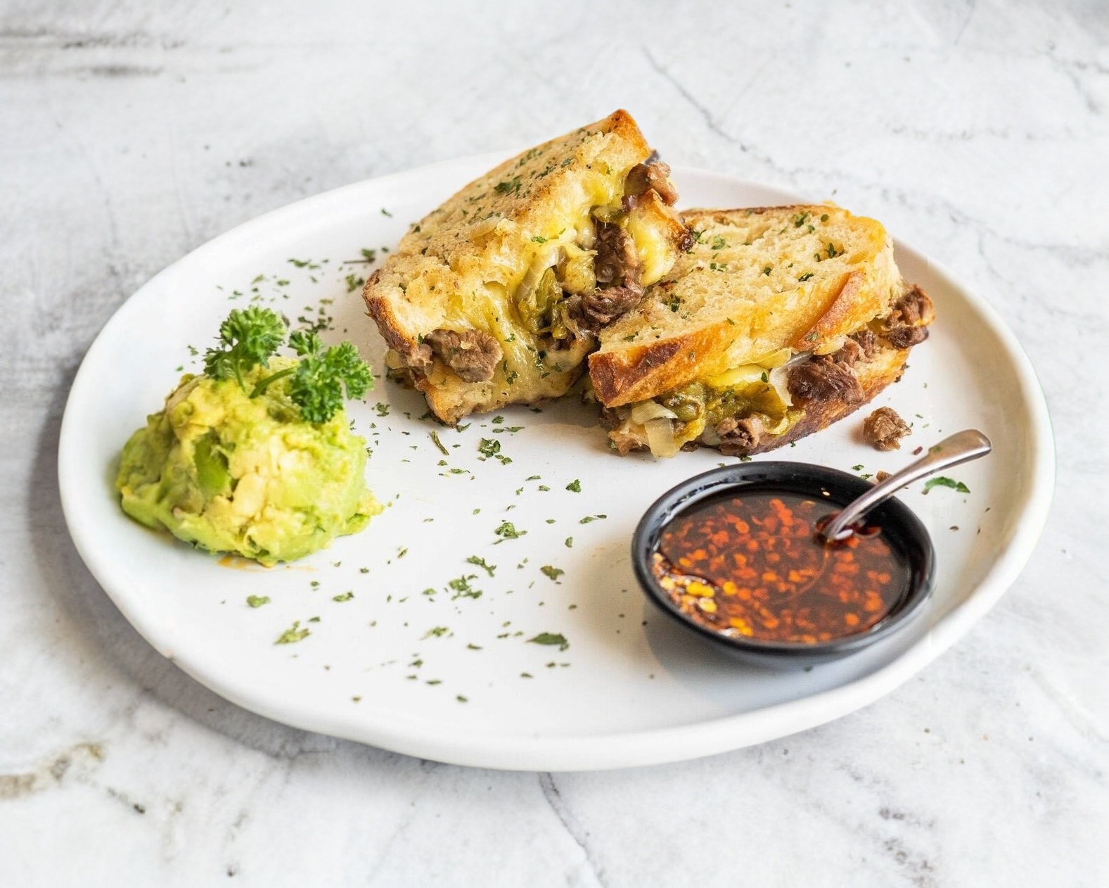 Pan masa madre, carne de res, aderezo de cebolla, , queso manchego, cebolla, chileverde, guacamole y salsa bandera.