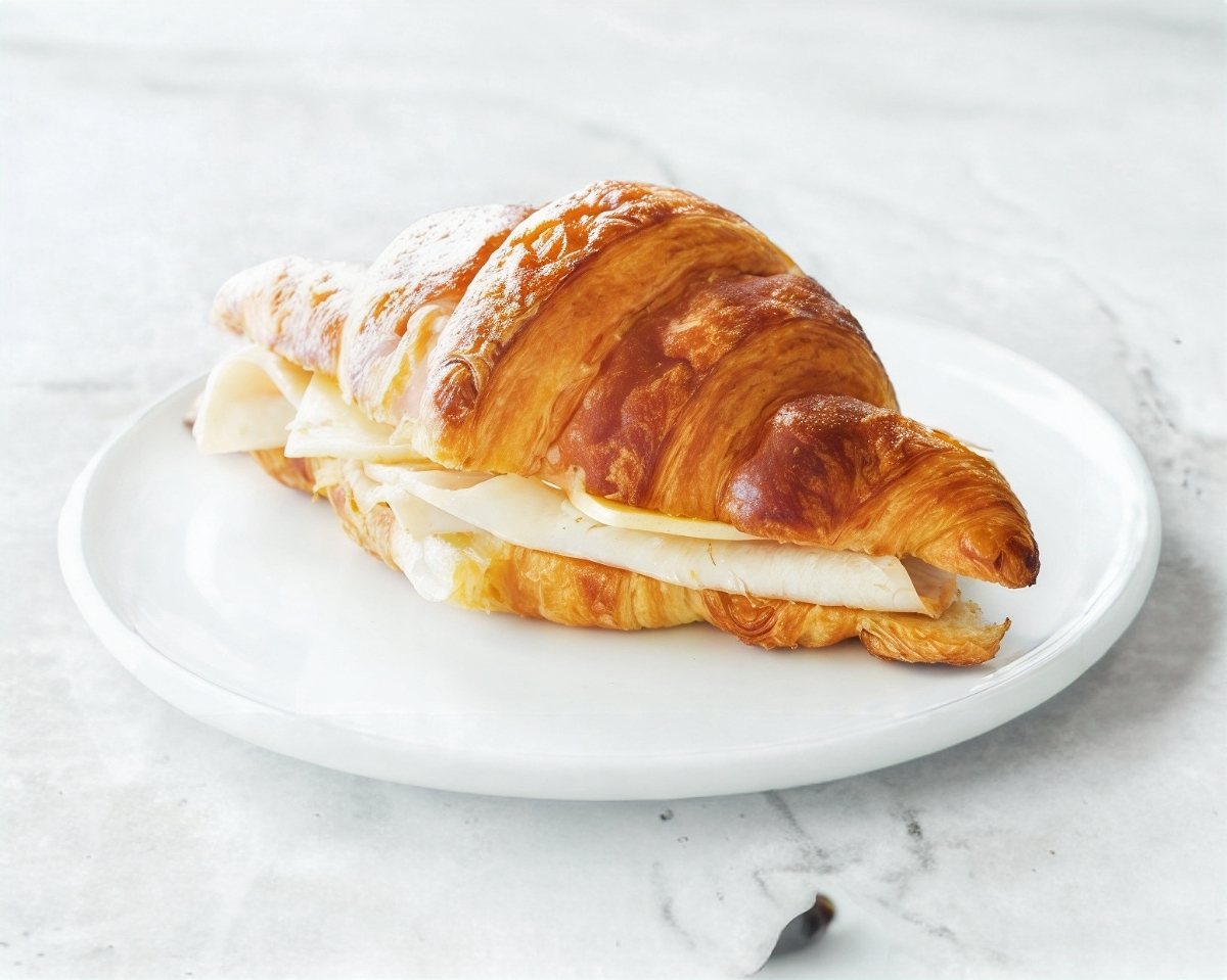 Croissant de jamón de pechuga de pavo, queso manchego. acompañado de aderezo chipotle.