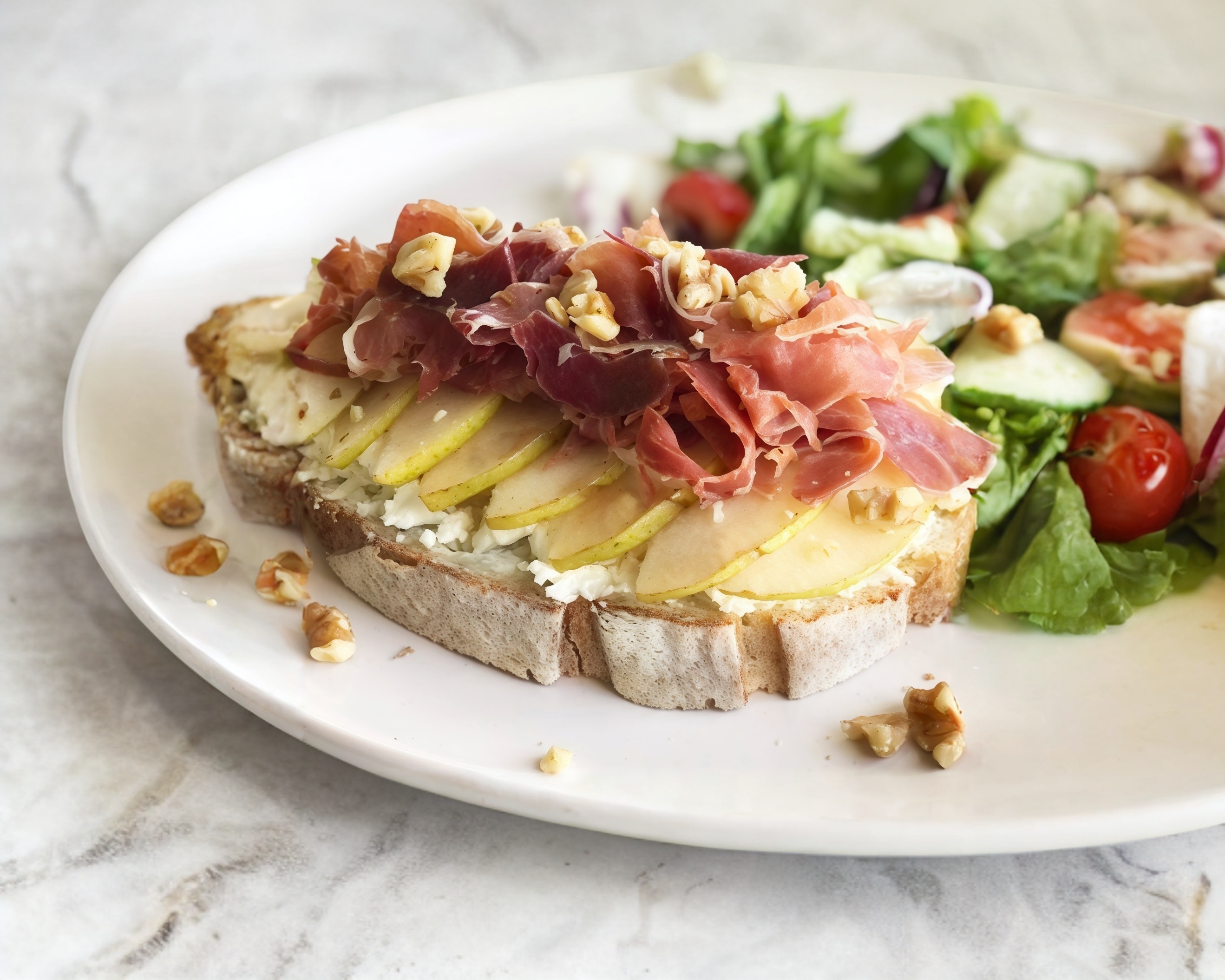 Pan masa madre, queso de cabra, pera, jamón serrano y nuez de castilla, se acompaña con salsa macha.