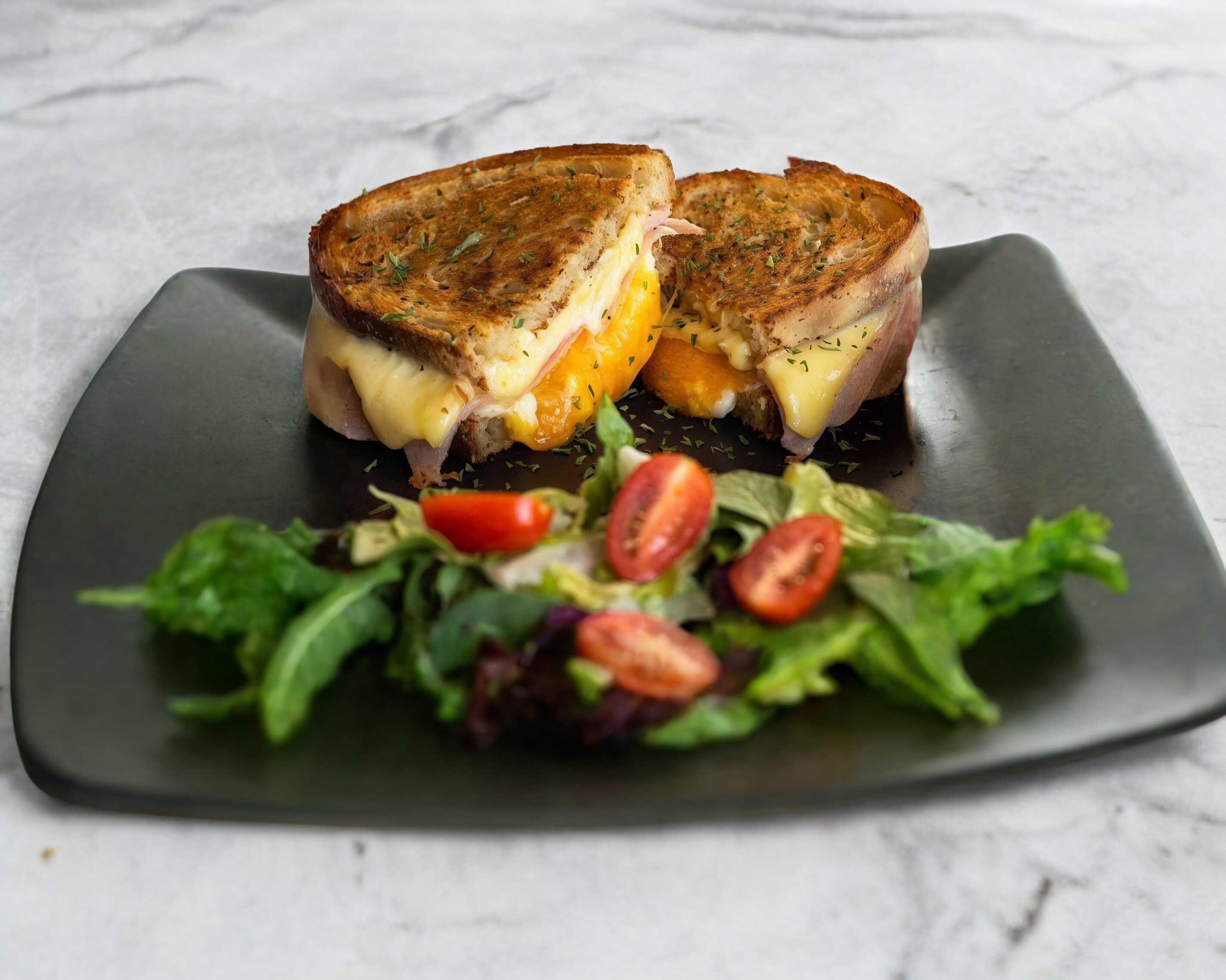 Pan masa madre con mantequilla y especies, jamón de pechuga de pavo, queso mozzarella, queso manchego y queso cheddar.