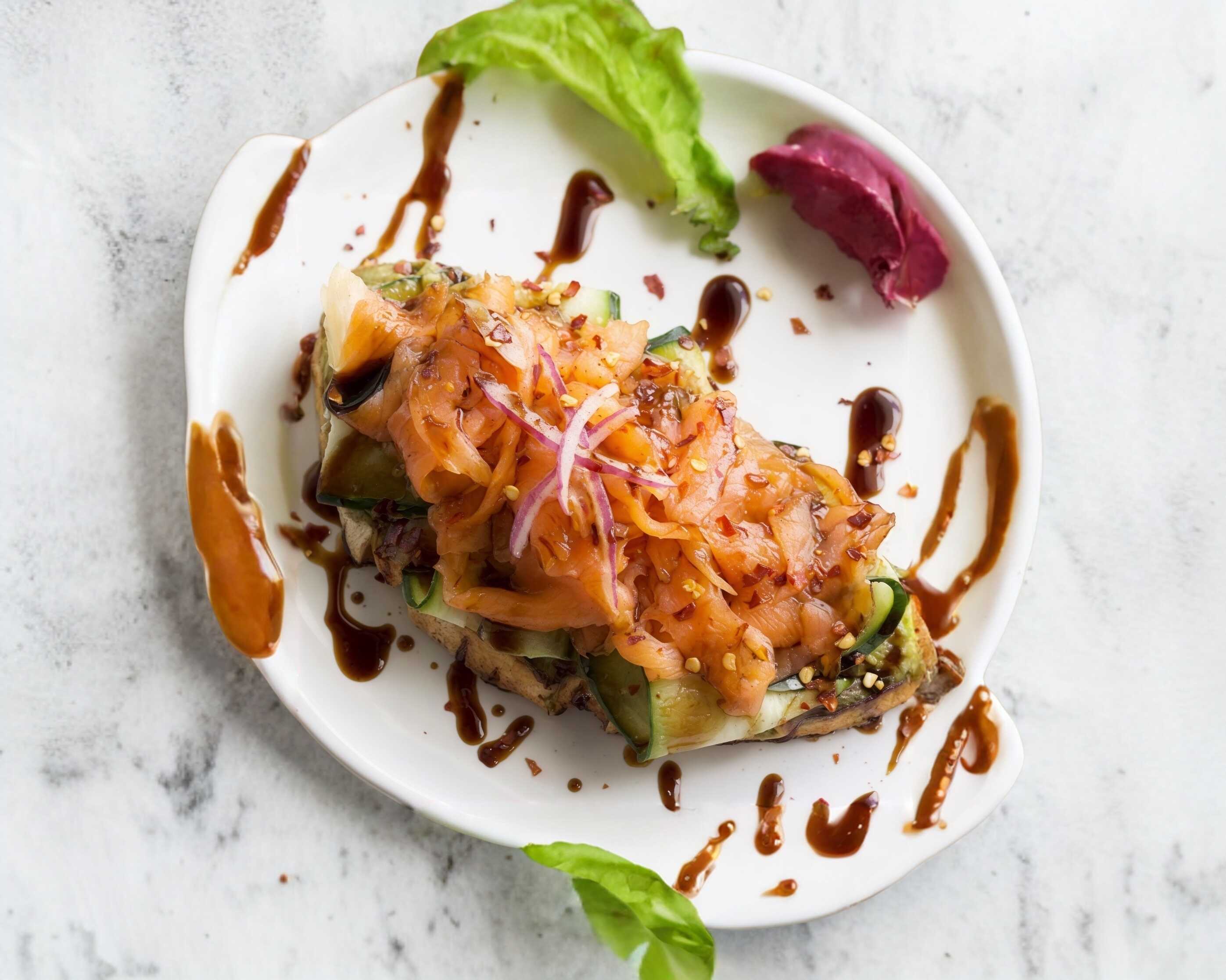 Pan masa madre, aguacate, salmón ahumado, pepino, cebolla morada y chile troceado. Acompañado de salsa macha.