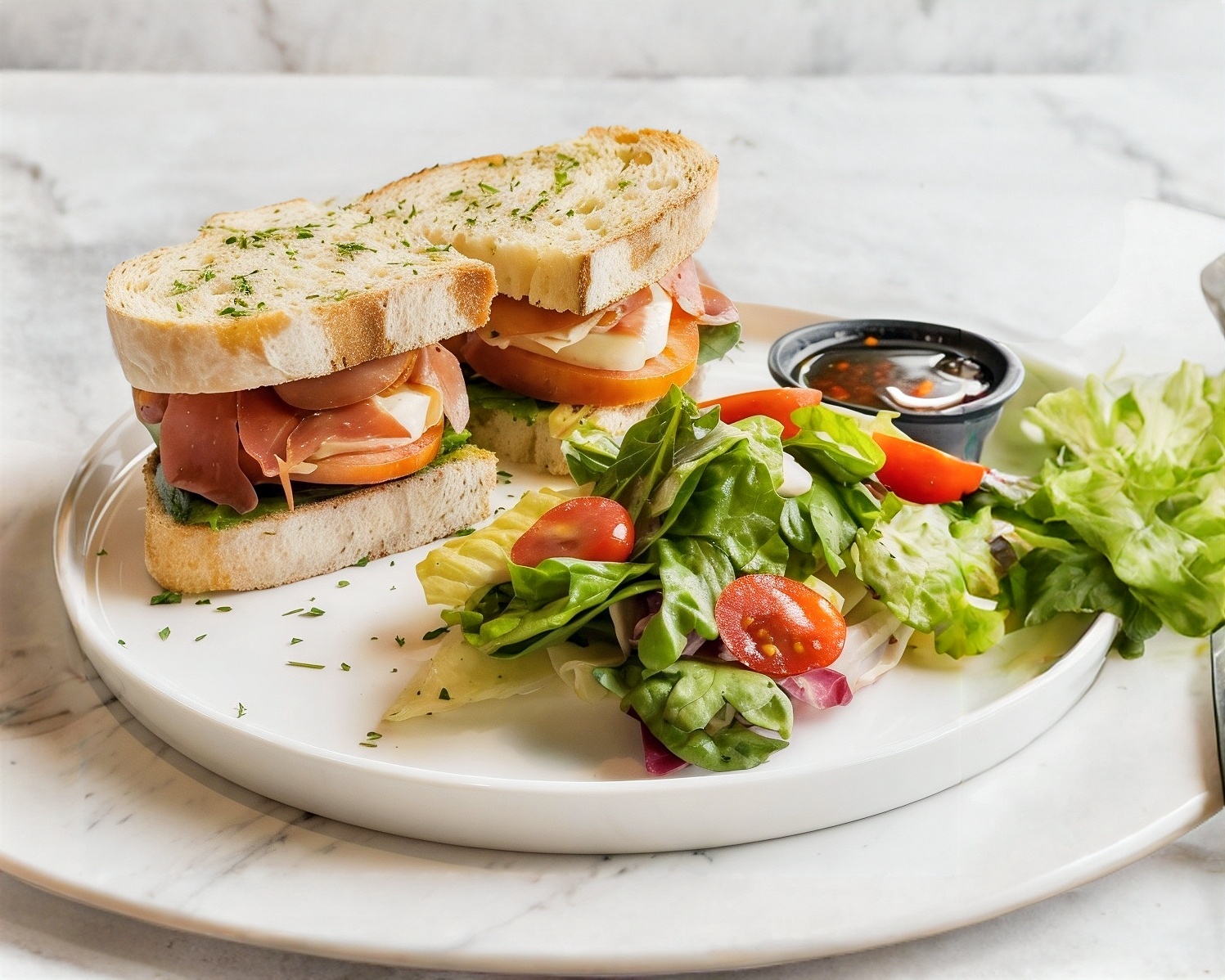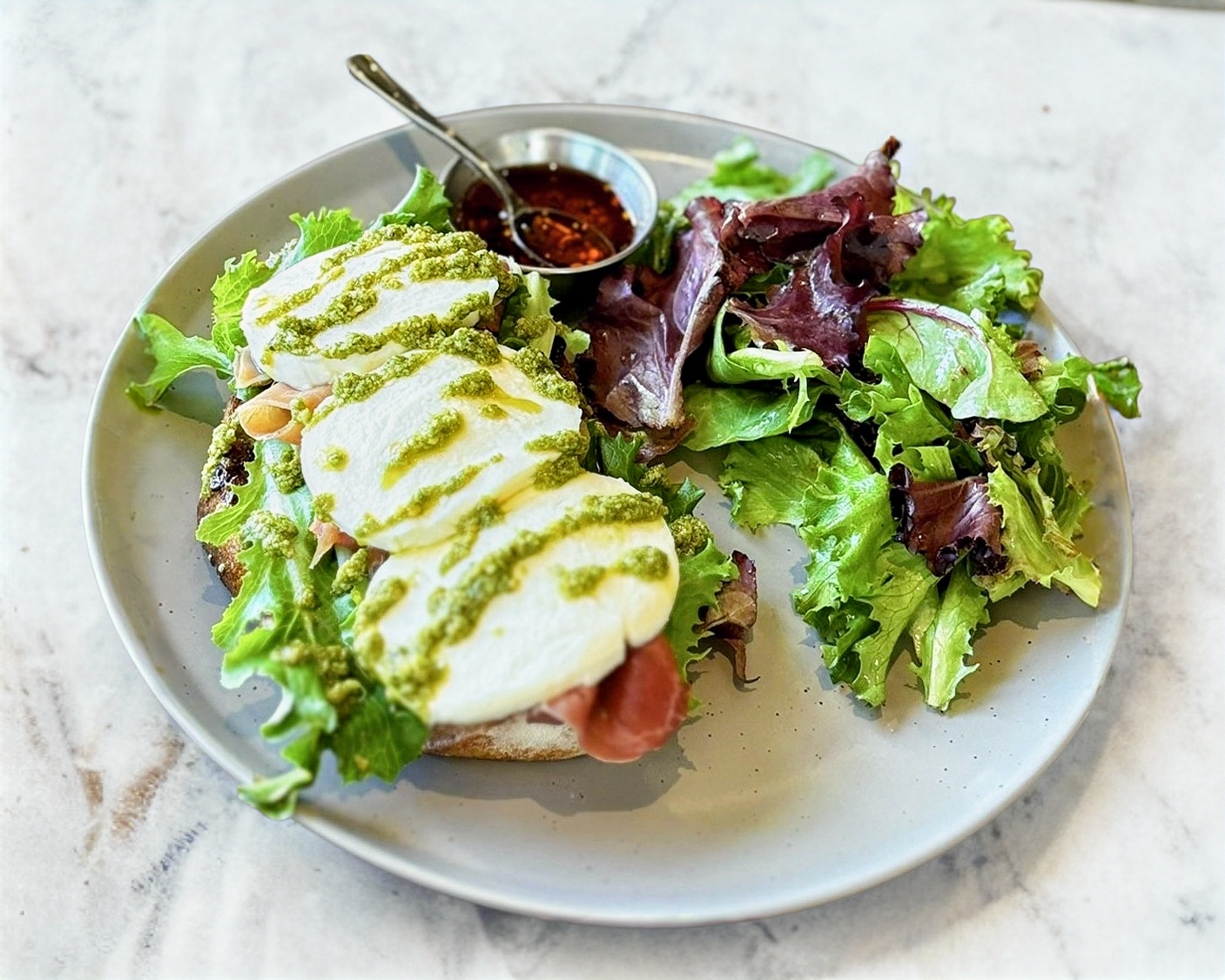 Pan masa madre, tomate deshidratado, lechugas, jamón serrano, queso mozzarella y pesto. Acompañado de salsa macha.