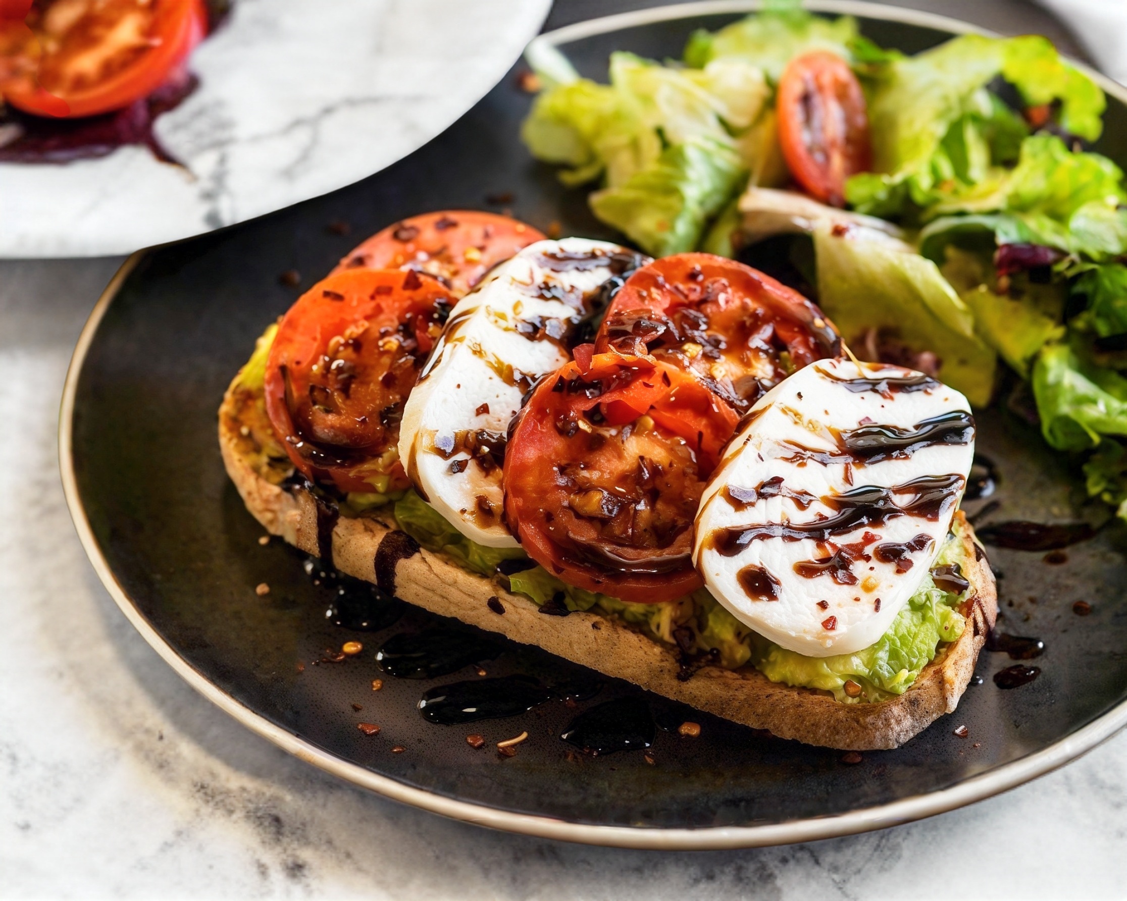 Pan masa madre, aguacate, mozzarella, tomate, aderezo balsámico y chile troceado. Acompañado de salsa macha.