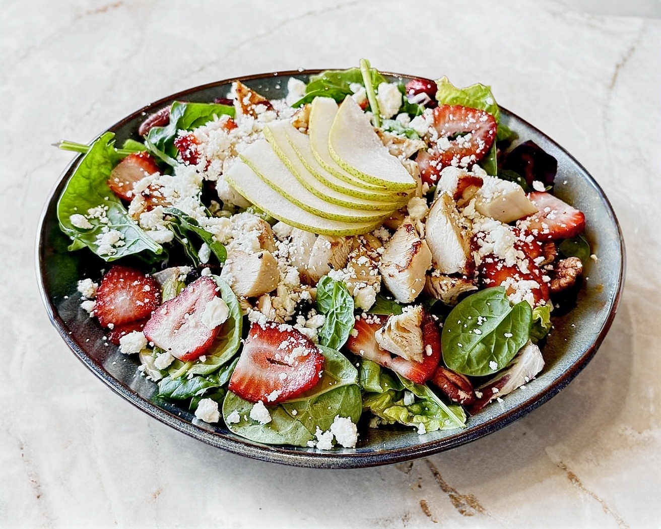 Lechuga, espinacas, pollo a la plancha, queso feta, arándanos, nuez, pera y fresa, se acompaña con aderezo cesar o vinagreta.