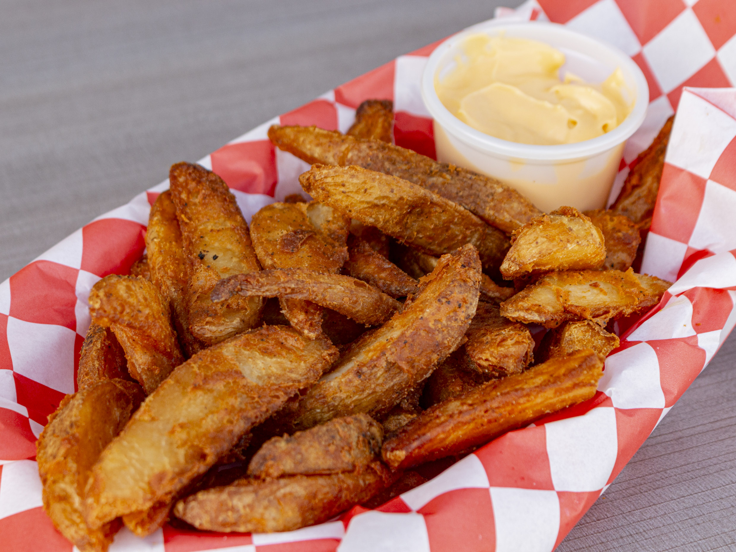 500Gr de papas sazonadas en gajos, bañadas en queso cheddar