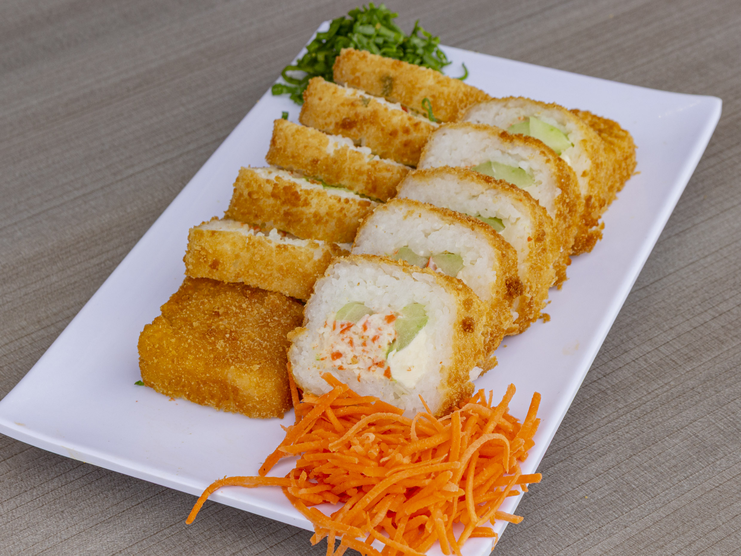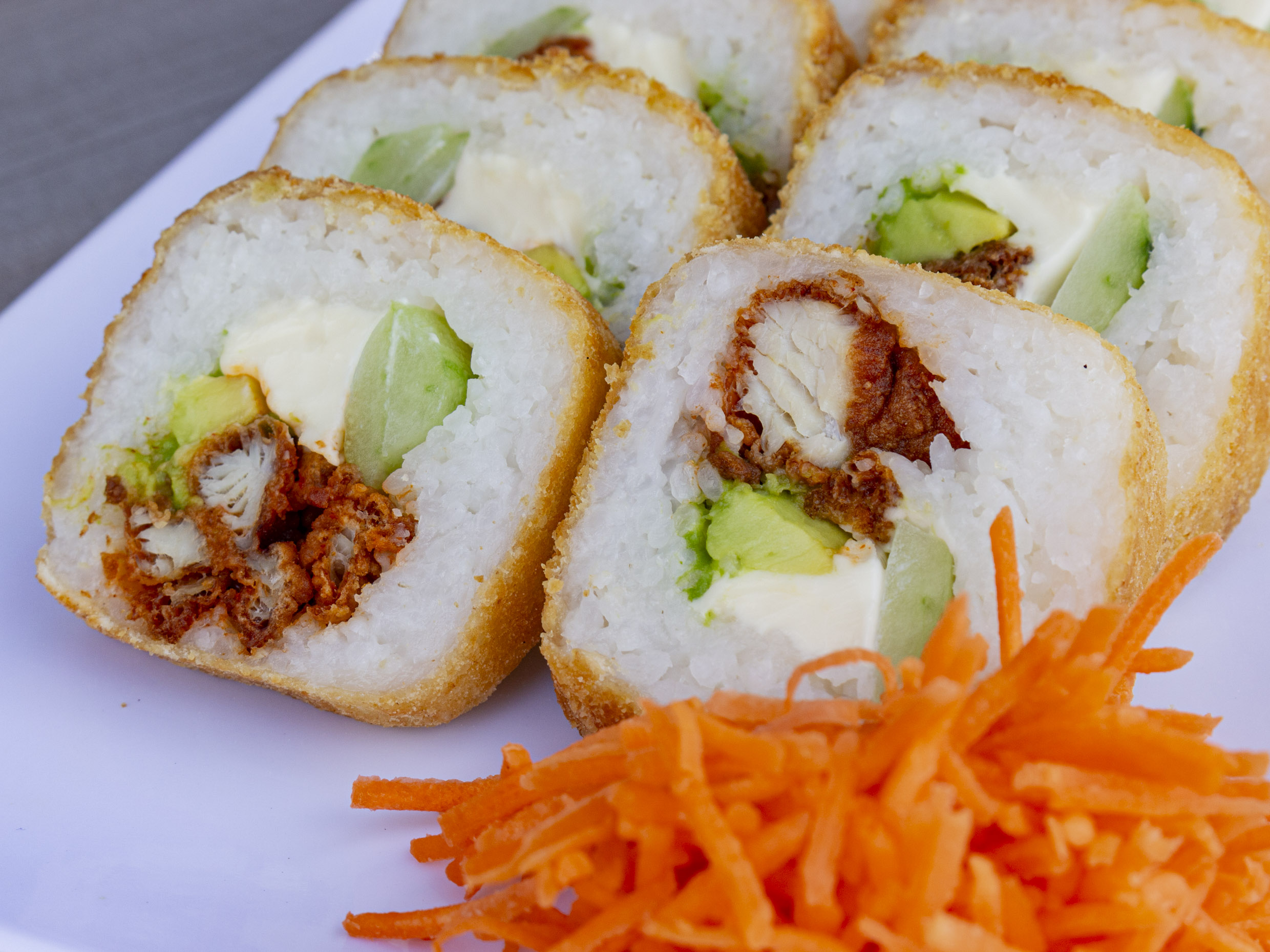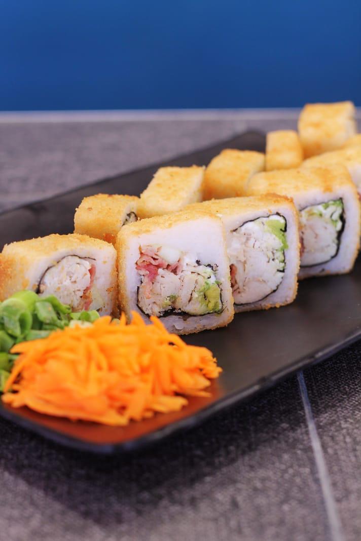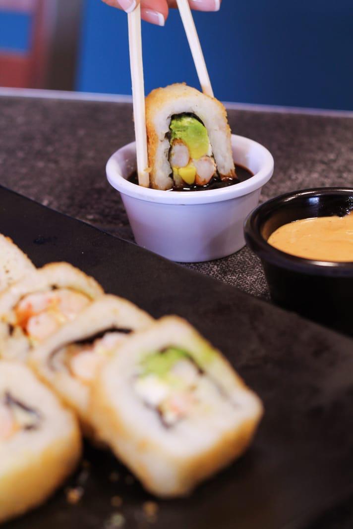 Boneless en salsa búfalo, Philadelphia, pepino y aguacate.Todos los rollos incluyen tampico.