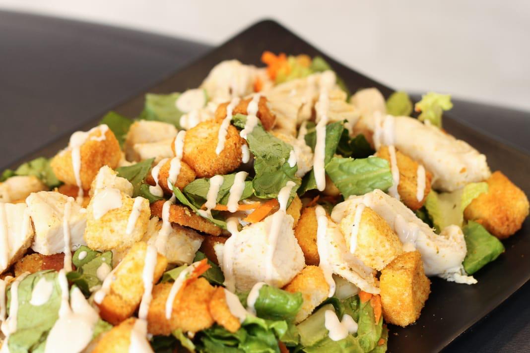 Lechuga, filetes de pollo empanizado, ajonjolí, parmesano, zanahoria, pepino crotones, apio y 4oz de aderezo.