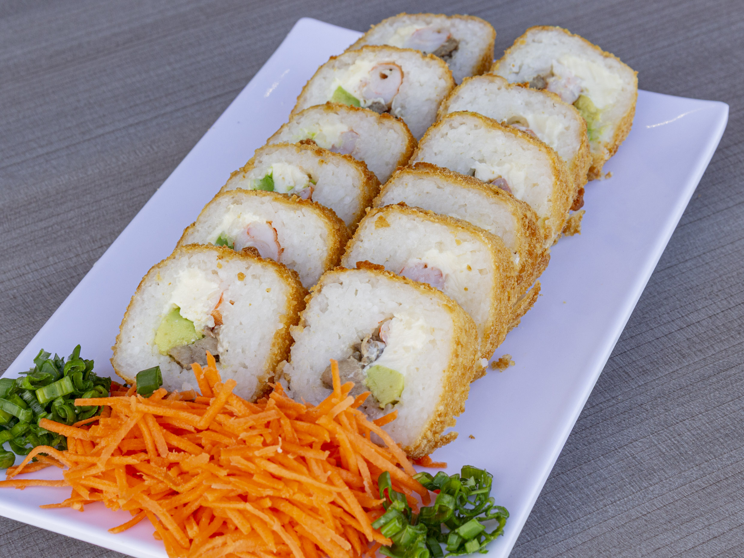 12 piezas: Camarón, tocino, queso philadelphia, queso crema, pepino y aguacate.Todos los rollos incluyen tampico.