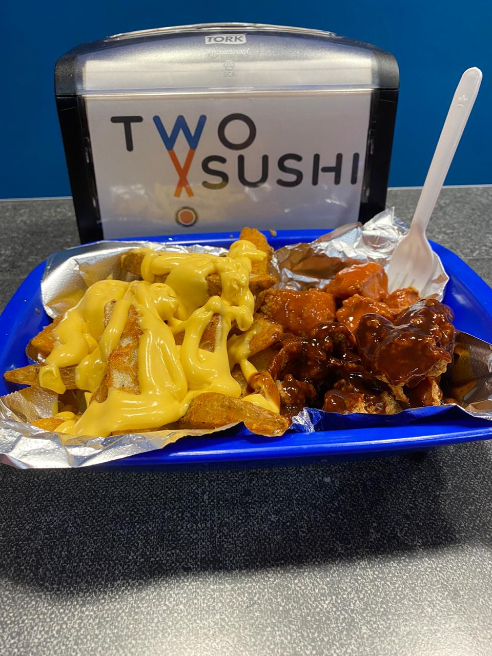 500Gr de papas sazonadas bañadas en queso cheddar, con tocino y cebollín, queso aparte.