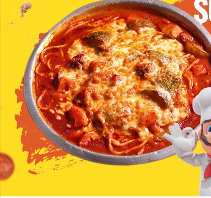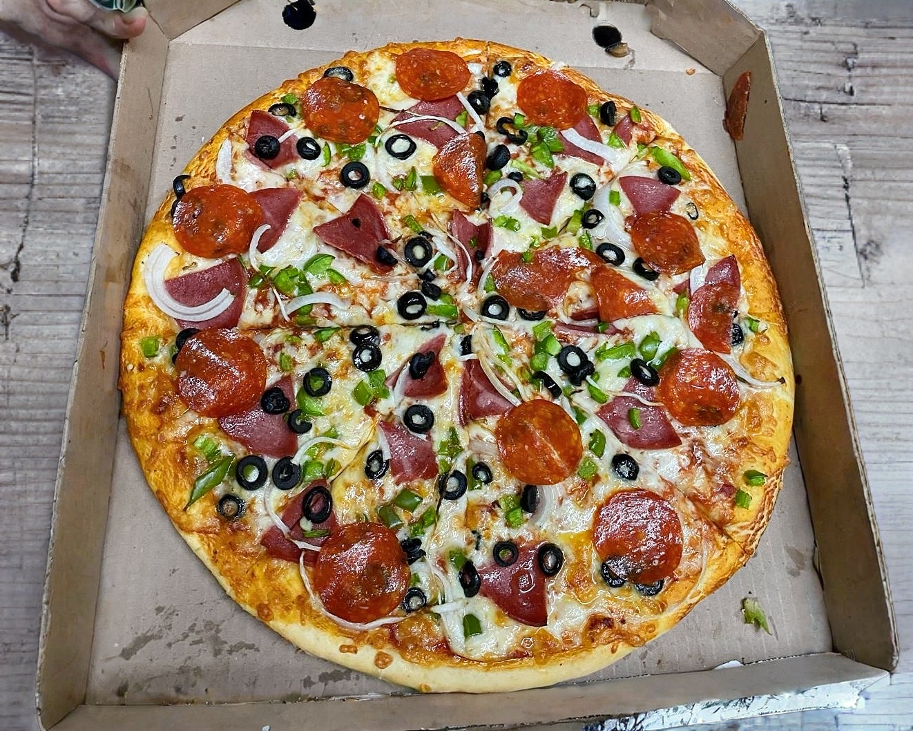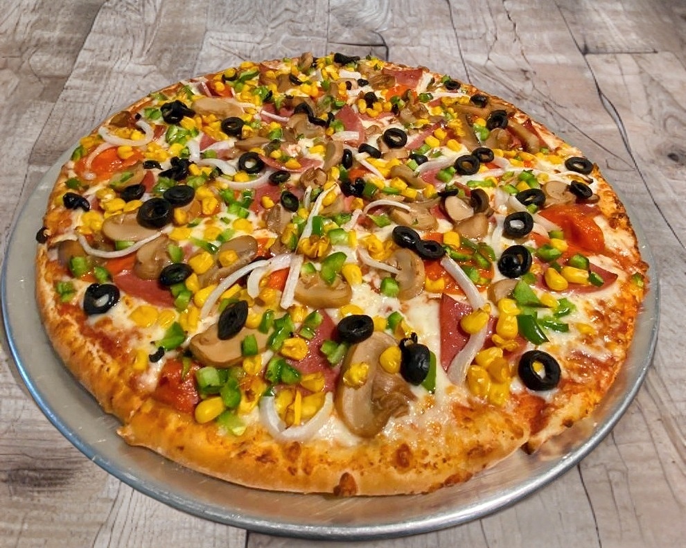 Pizza en masa de harina con salami, champiñón, pimiento verde, aceituna negra, cebolla blanca, pepperoni y elote