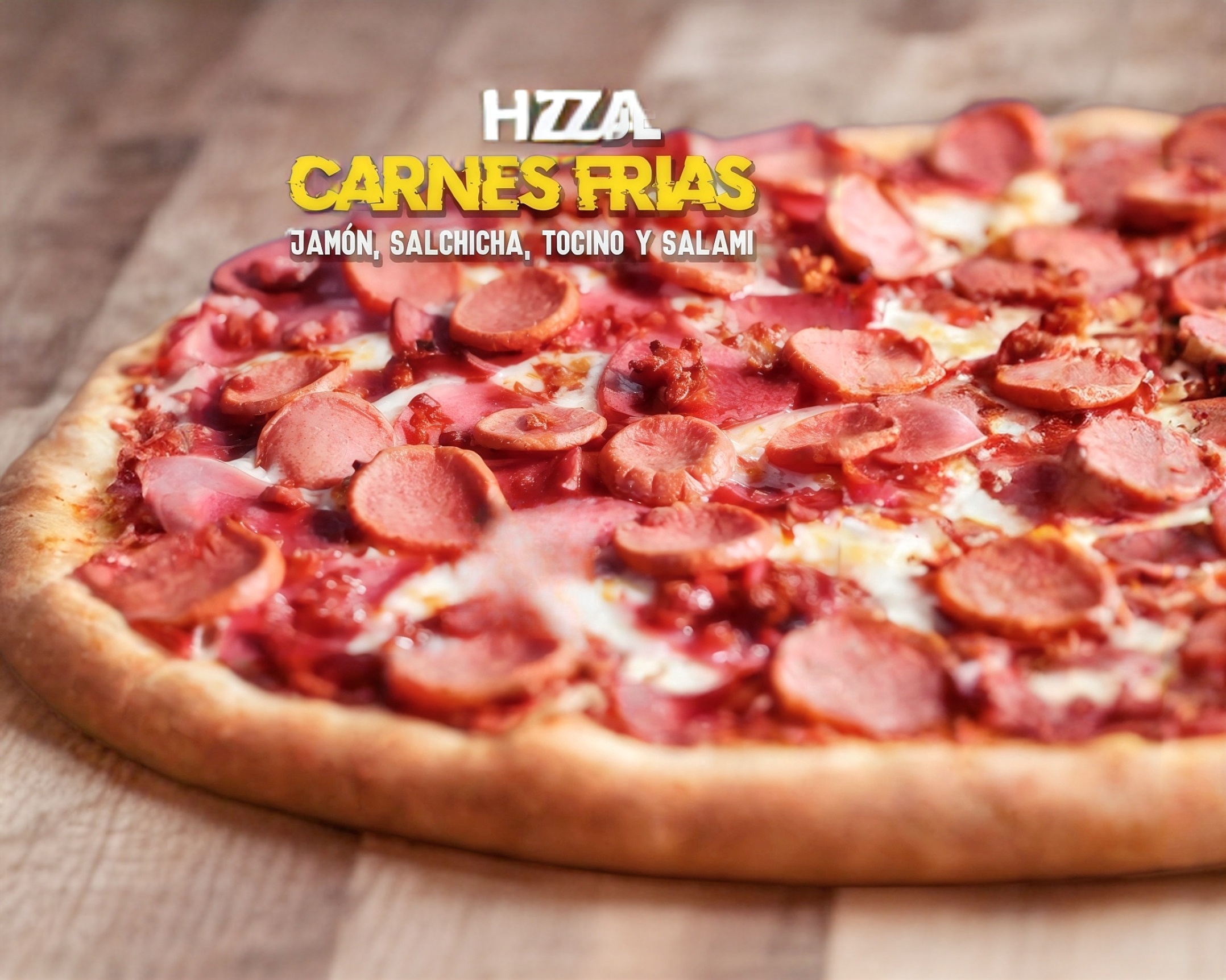 Pizza en masa de harina con jamón, salchicha, tocino y salami, tamaño mediano.