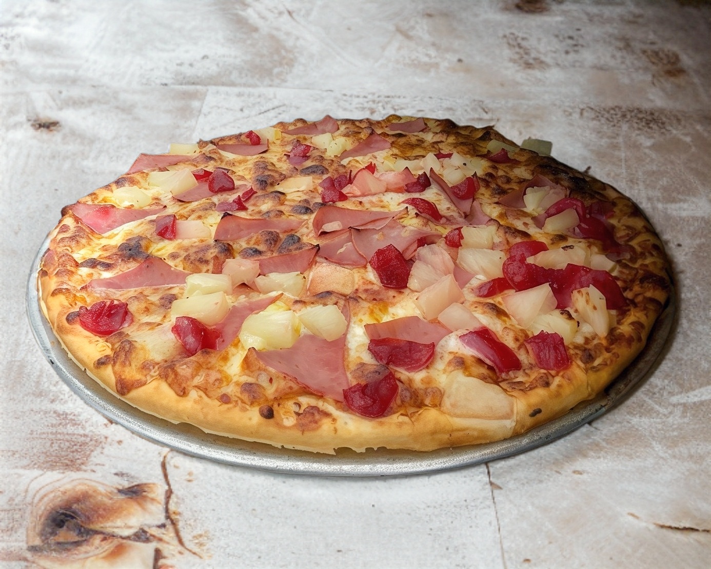 Pizza en masa de harina con jamón, cereza y piña, tamaño mediano.