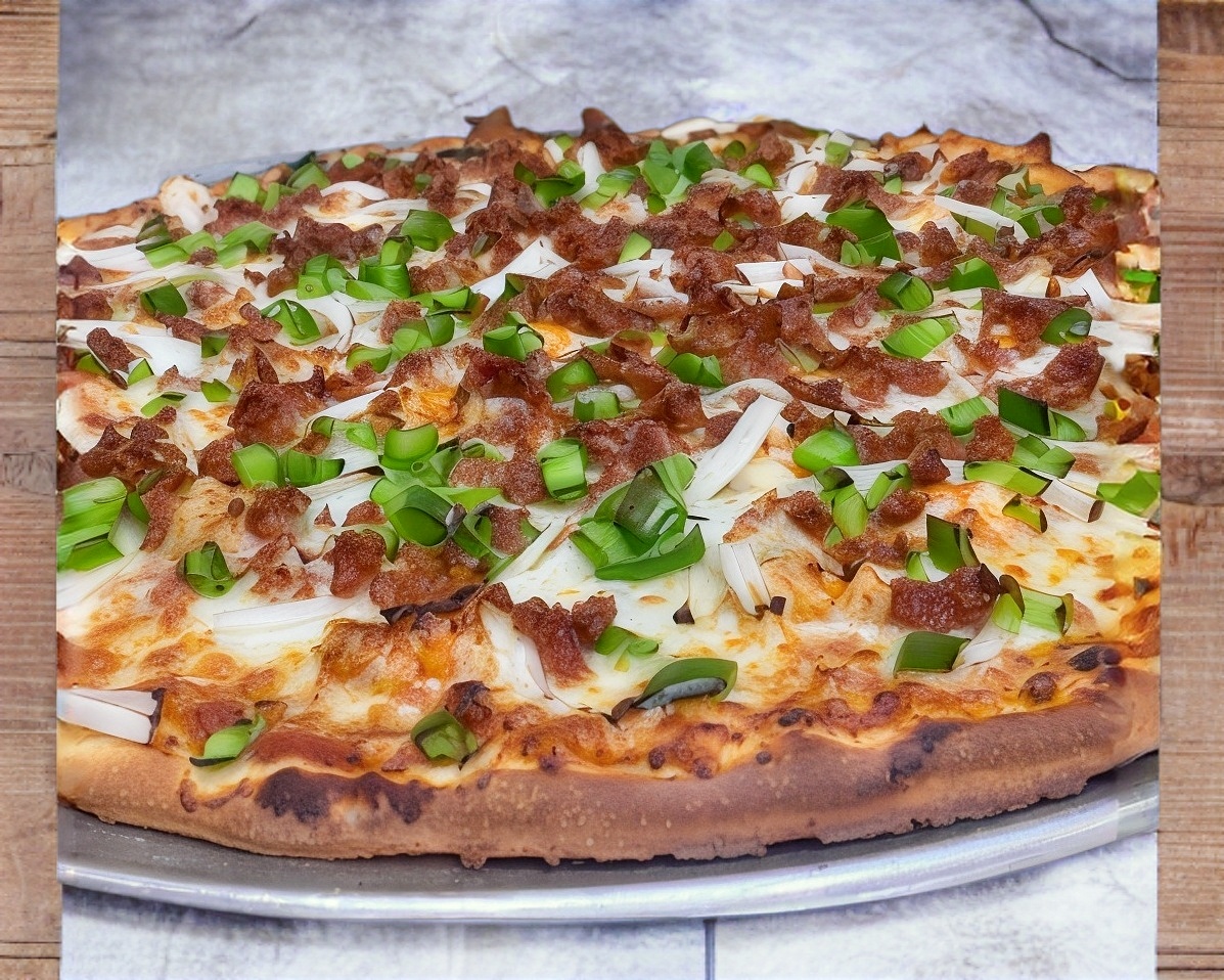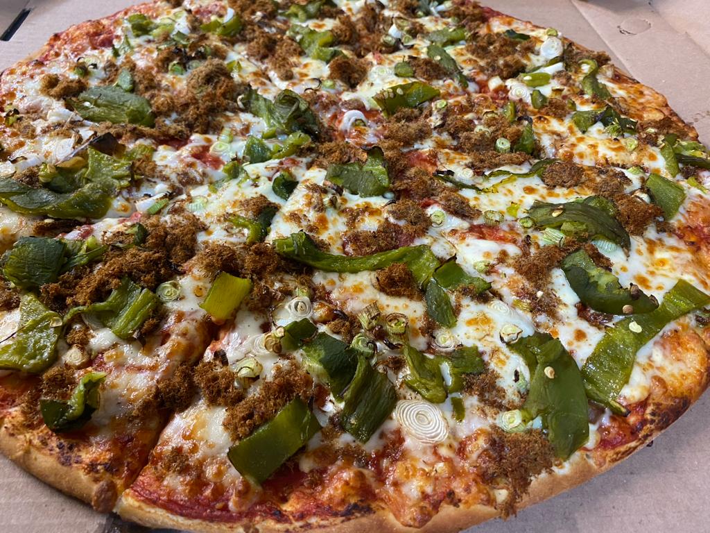 Pizza en masa de harina con machaca, cebolla cambray y chile verde, tamaño mediano.