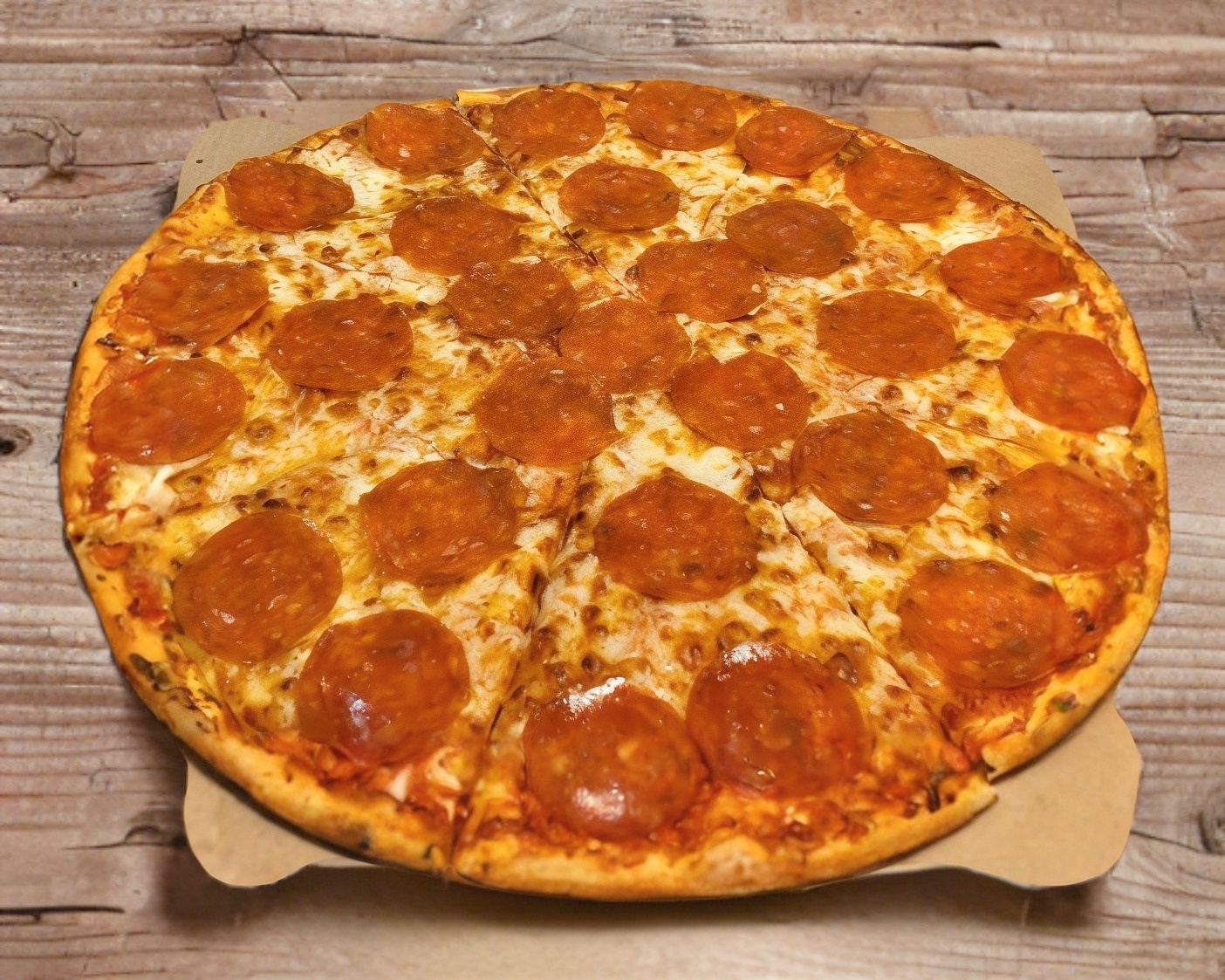 Pizza en masa de harina con pepperoni, tamaño mediano.