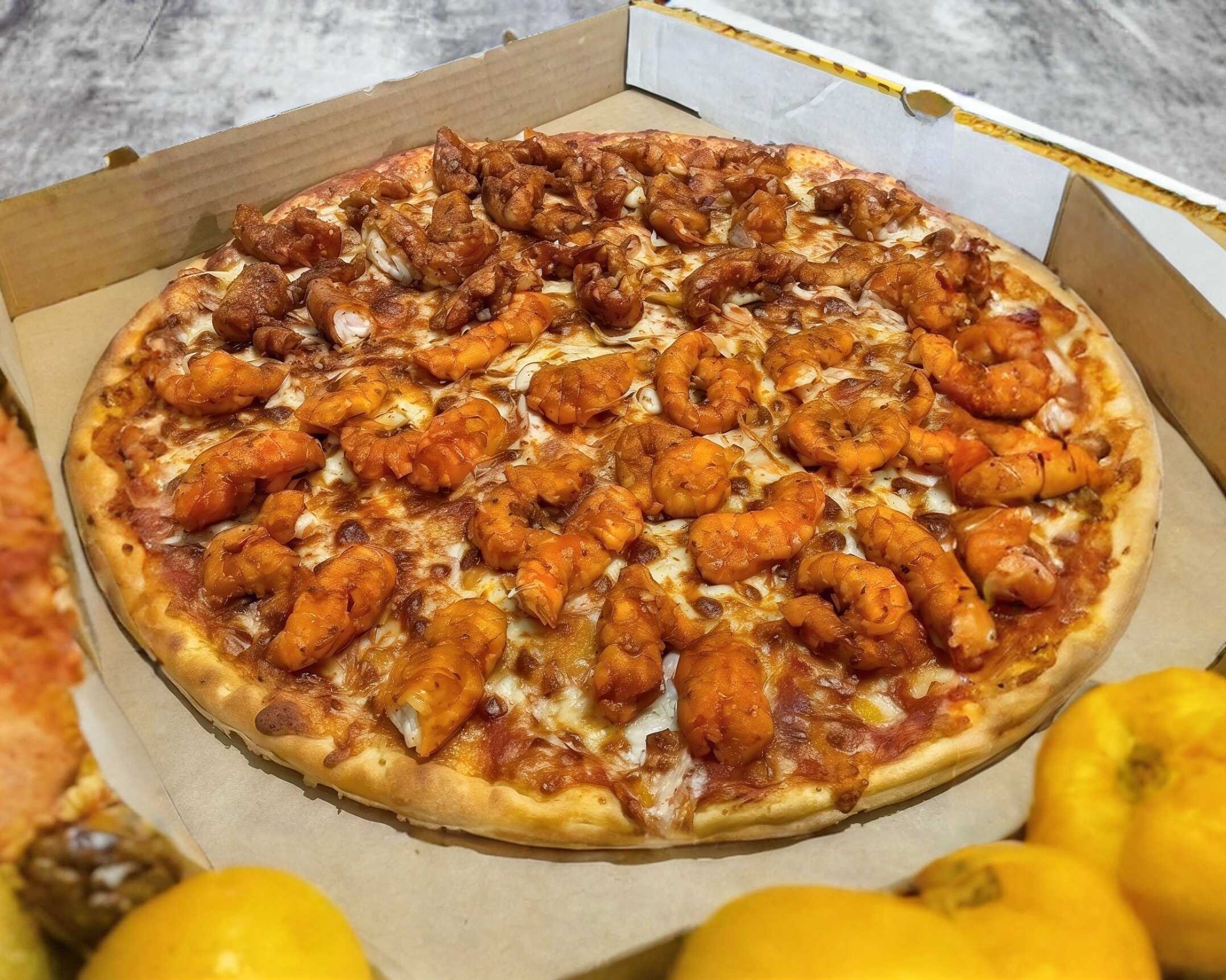 Pizza en masa de harina con boneless 250 gr con salsa a elegir, tamaño grande.