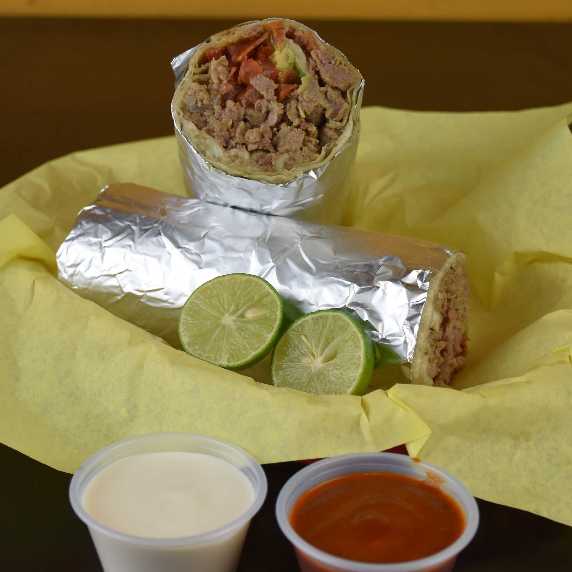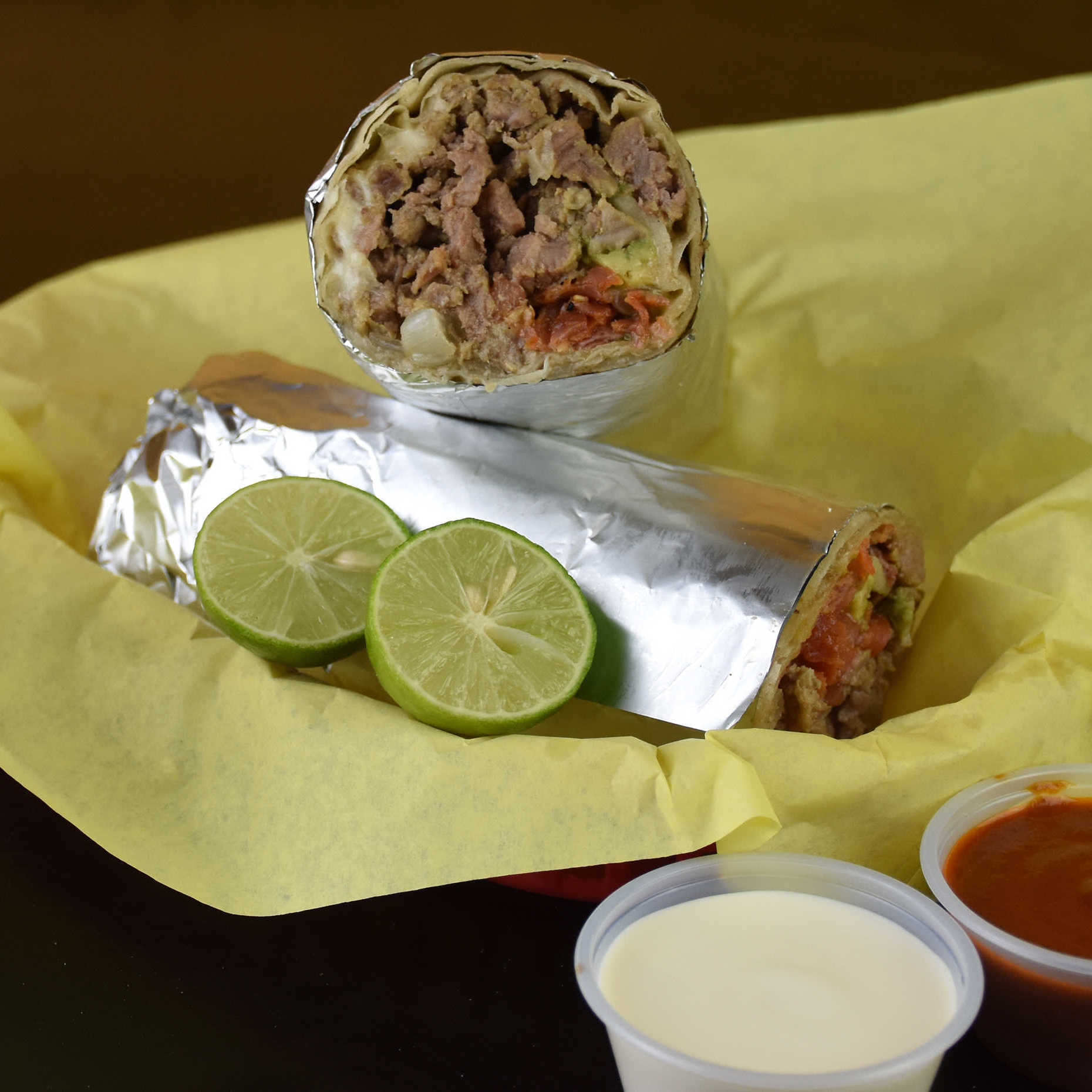 Carne, aguacate, tomate, queso y bañado en salsa especial.