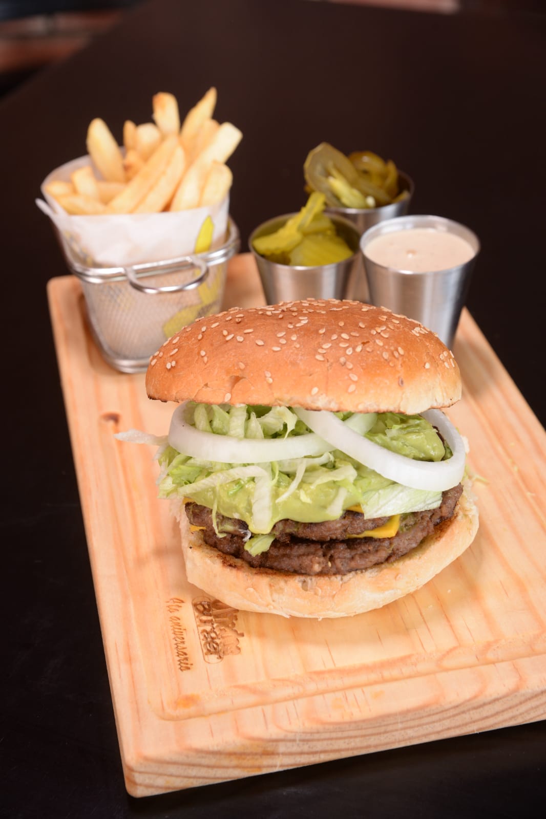 Doble carne, doble queso, verdura, aguacate y papas.