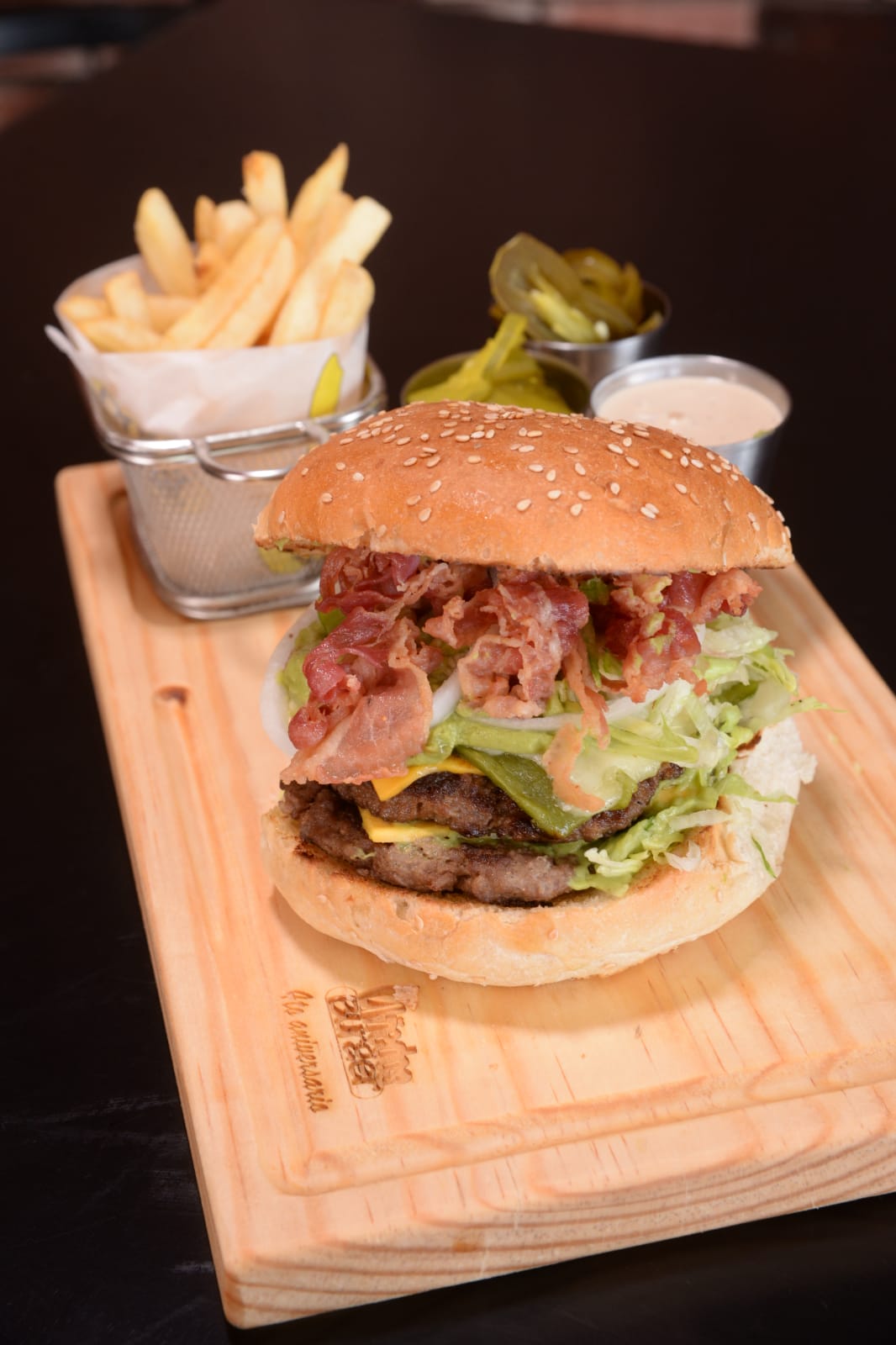 Doble carne, tocino, doble queso, verdura, aguacate y papas.