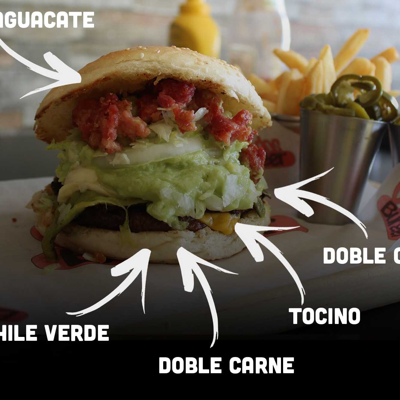 Doble carne, doble queso, tocino, chile verde, verdura, aguacate y papas.