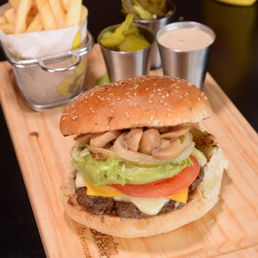Carne, aguacate, tomate, queso, champiñones y cebolla asada.