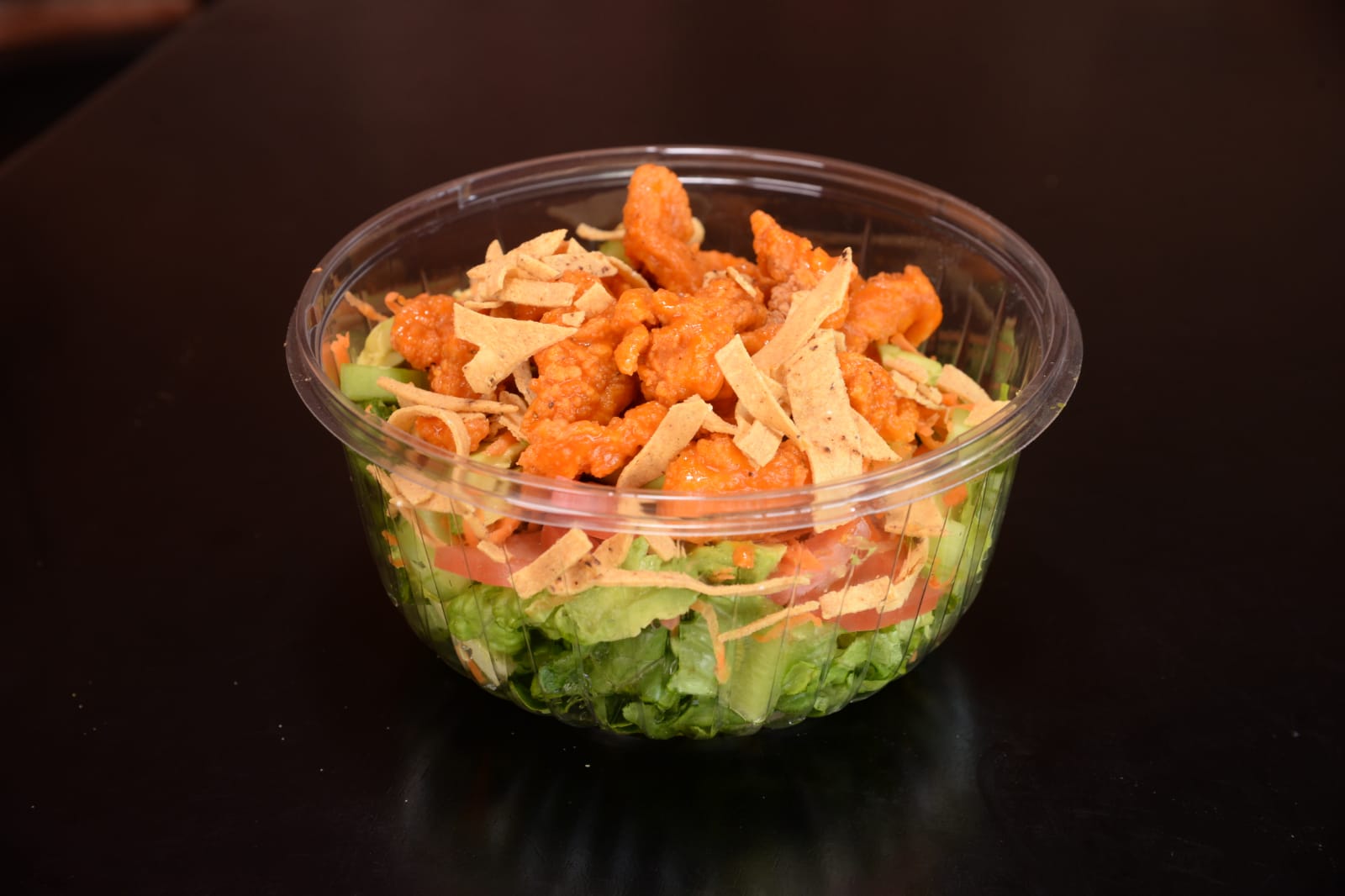 Boneless, lechuga, zanahoria, pepino, aguacate, aderezo y crotones o tiritas de maíz.