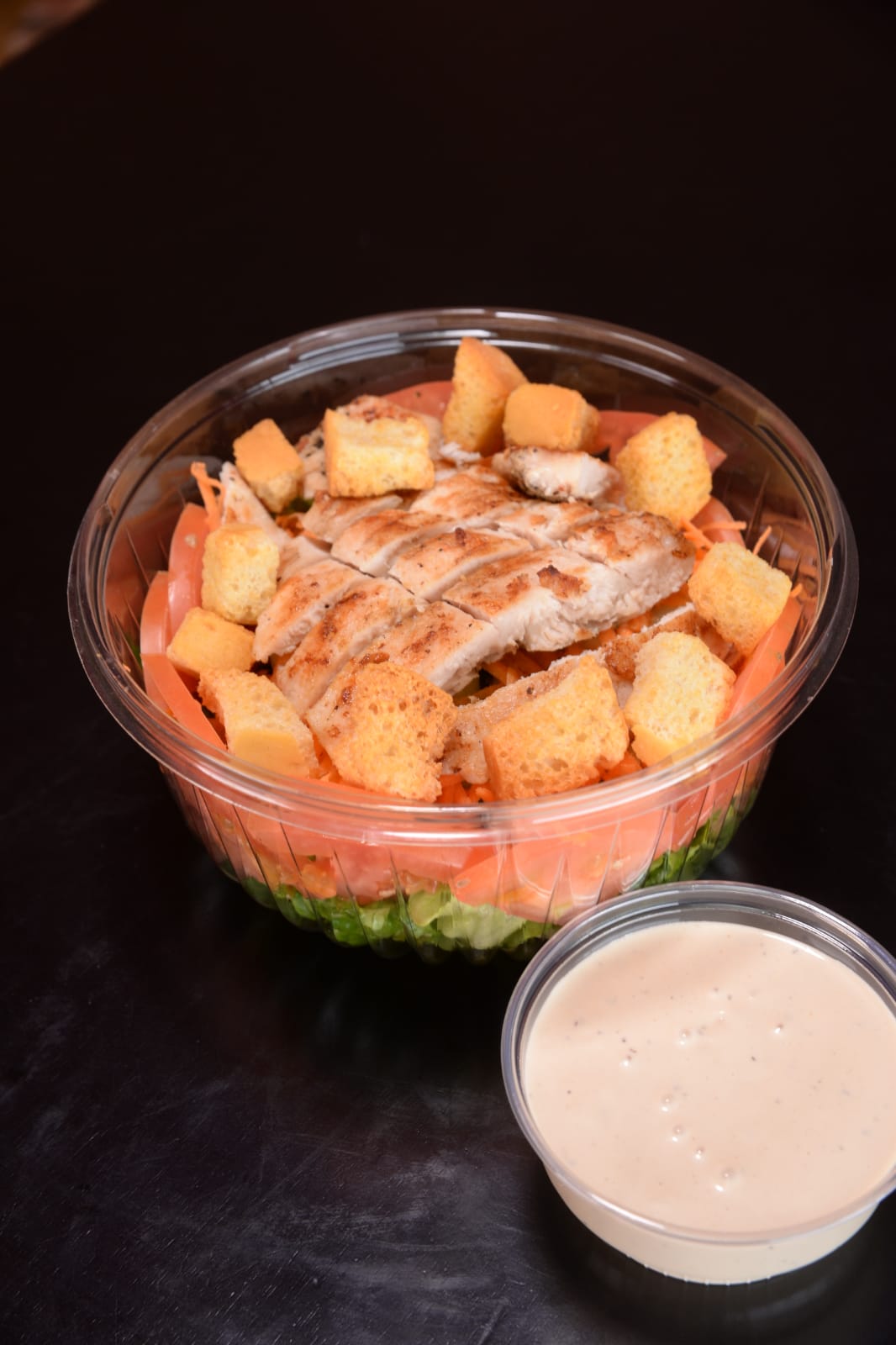 Pollo a la parrilla, lechuga, tomate, zanahoria, pepino, aceituna negra, jamón, queso, aderezo y crotones o tiritas de maíz.
