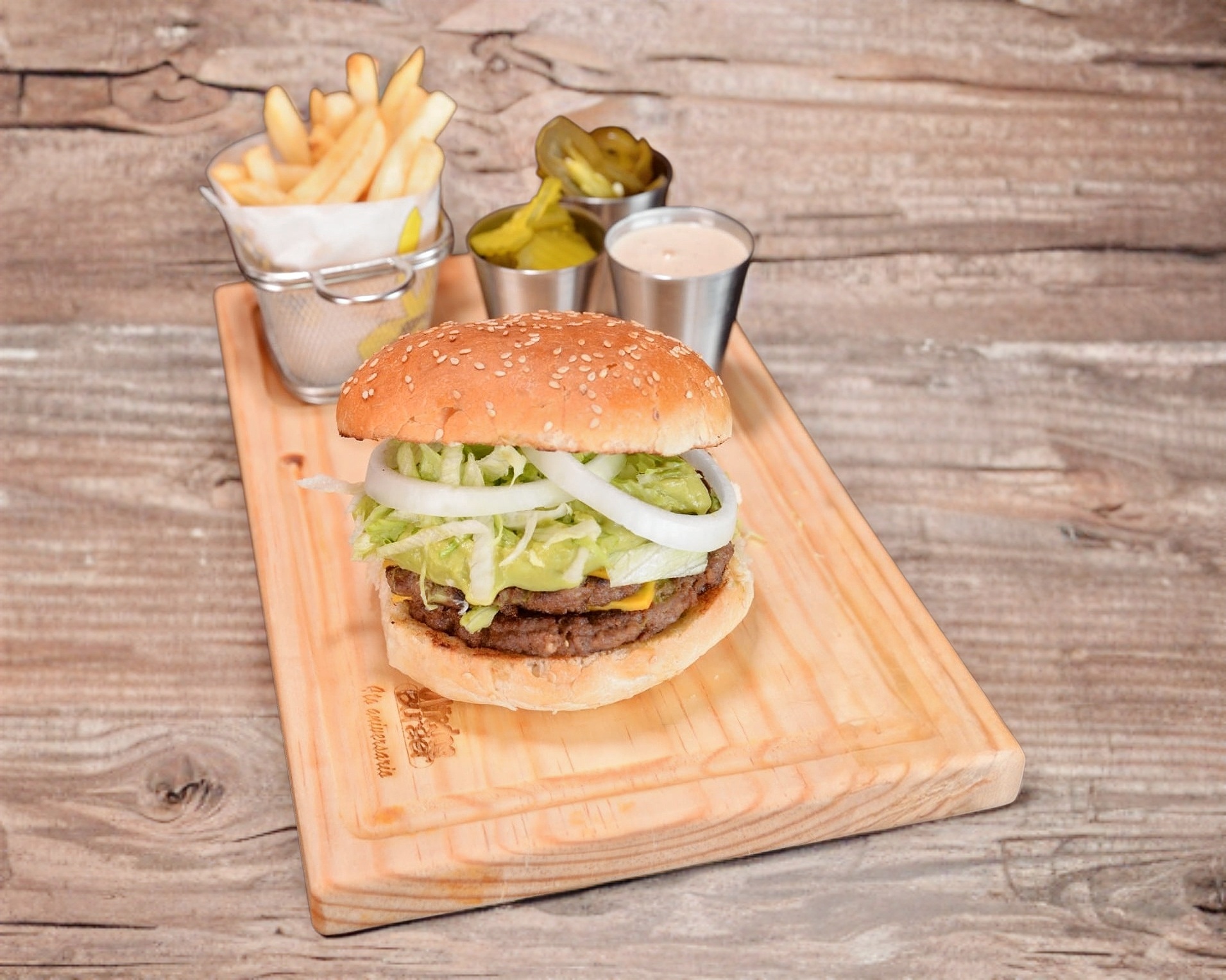 Doble carne, doble queso, verdura, aguacate y papas.