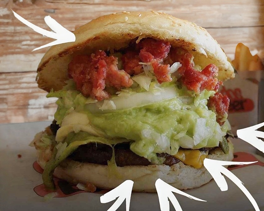Doble carne, tocino, doble queso, verdura, aguacate y papas.