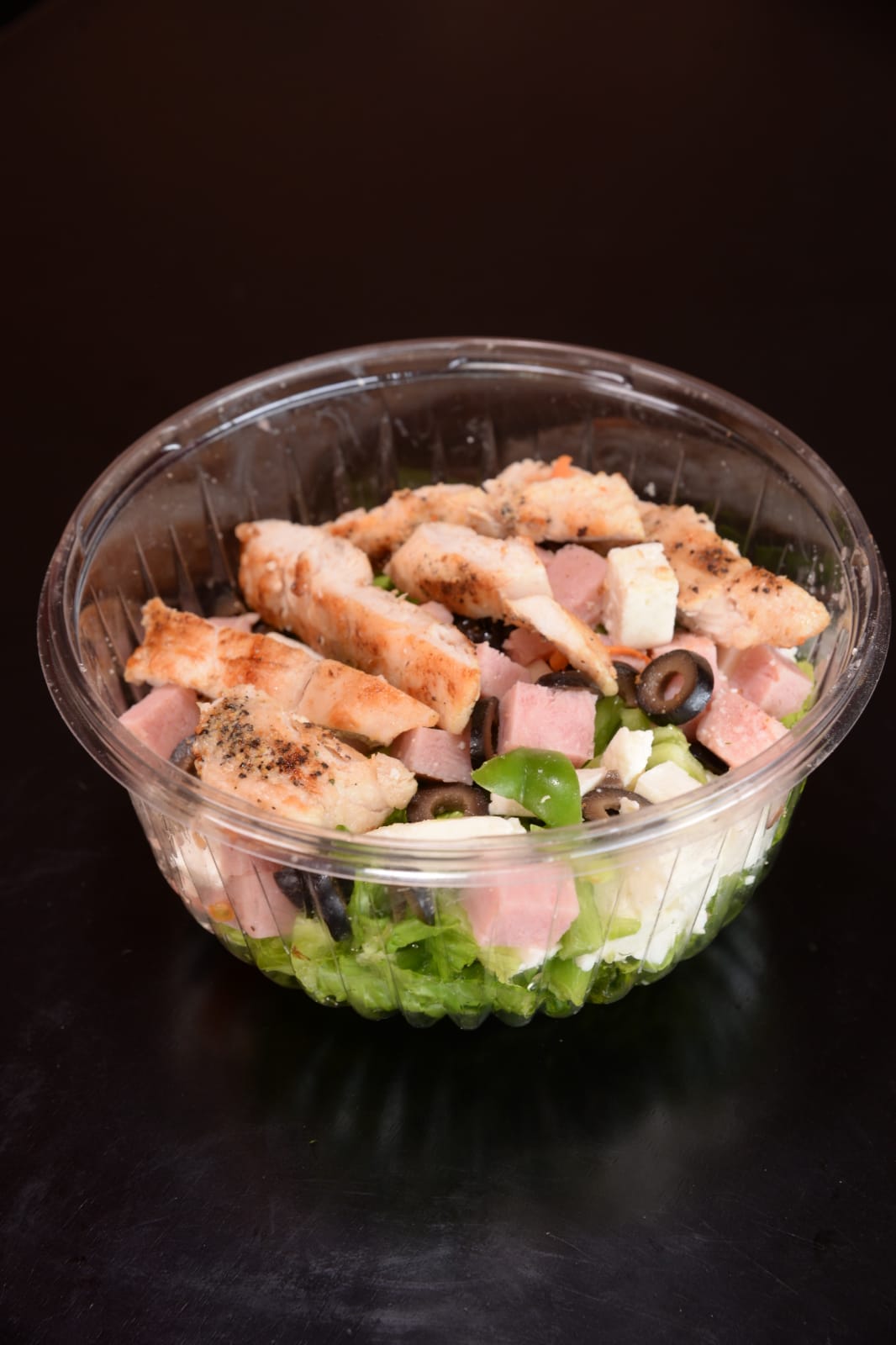 Pollos a la parrilla, lechuga, tomate, pepino, aguacate, zanahoria, aceituna negra, jamón, queso y queso.