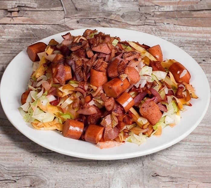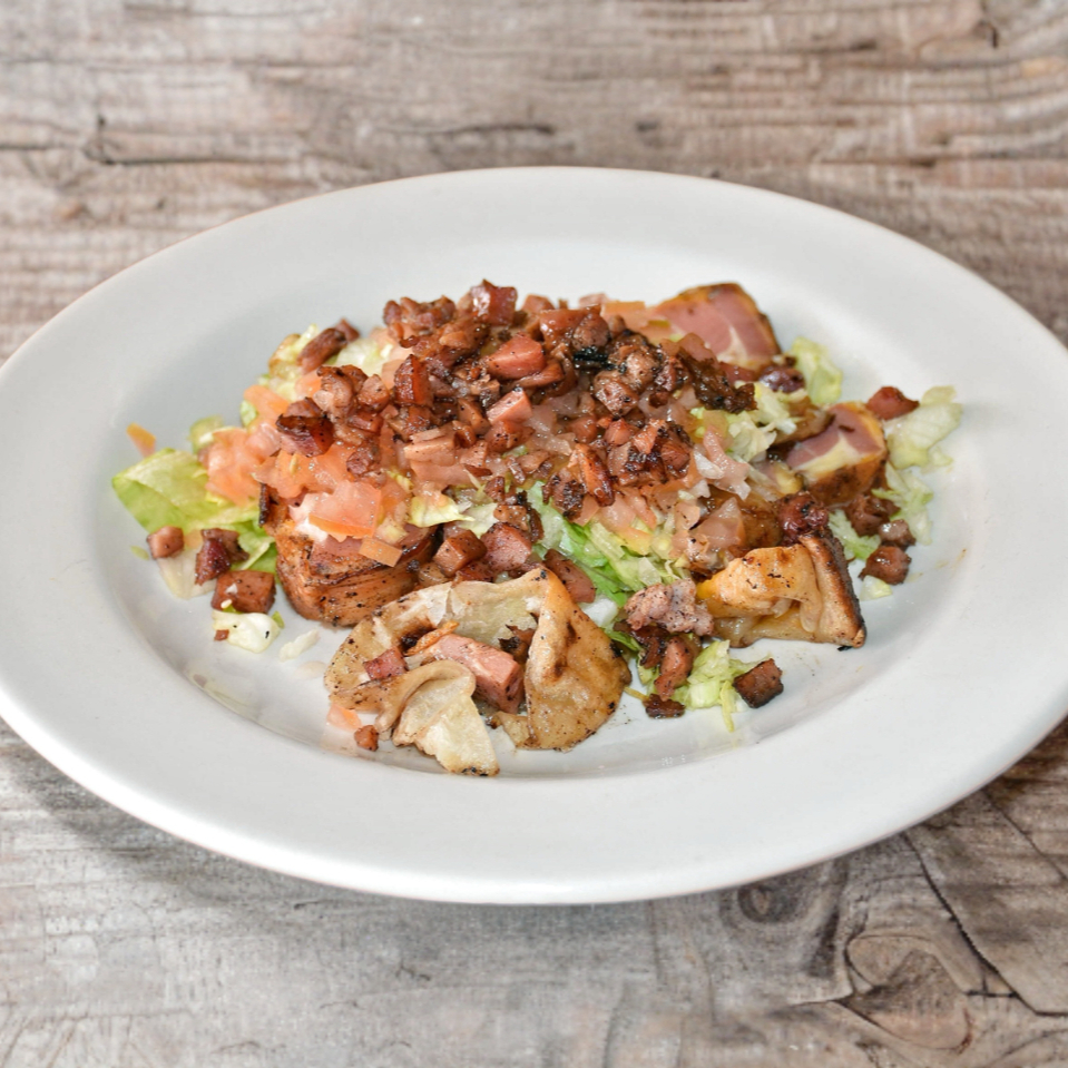 Carne de res con una mezcla de chorizo, salchicha rosarito, tocino y queso chihuahua gratinado montado sobre la carne, lechuga, tomate acompañado con papas.